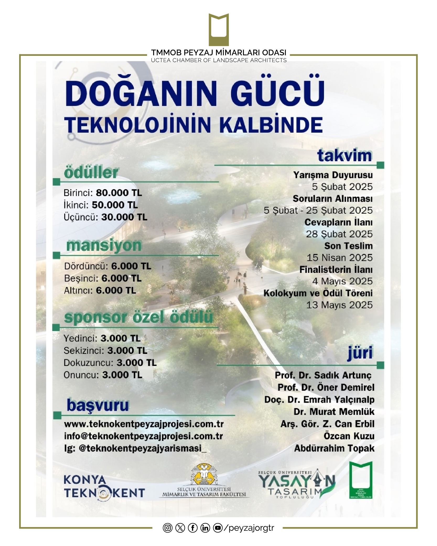 Odamız Konya İl Temsilciliği’nin destekleyen kurum olarak yer aldığı Teknokent Peyzaj Tasarımı Öğrenci Proje Fikir Yarışması; Türkiye geneli Peyzaj Mimarlığı bölümünde öğrenim gören lisans öğrencilerine açıktır. Katılımcılar bireysel ya da ekip olarak başvurabilir. Bireysel olarak başvuracak katılımcıların 3. ve 4. sınıf olması gerekmektedir. Ekip olarak katılacak grupların ekip lideri ise 3 veya 4. sınıf olarak belirlenmesi zorunludur. Ekip sayısı en fazla 4 kişi olmalıdır. Yarışmacılar, başvuru formunu doldurarak ve gerekli belgeleri eksiksiz şekilde teslim ederek yarışmaya katılabilir. Yarışma, katılımcılar için ücretsizdir. Yarışmaya sunulan projelerin özgün olması gerekmektedir. Daha önce başka bir yarışmaya katılmış veya uygulanmış projeler kabul edilmeyecektir.