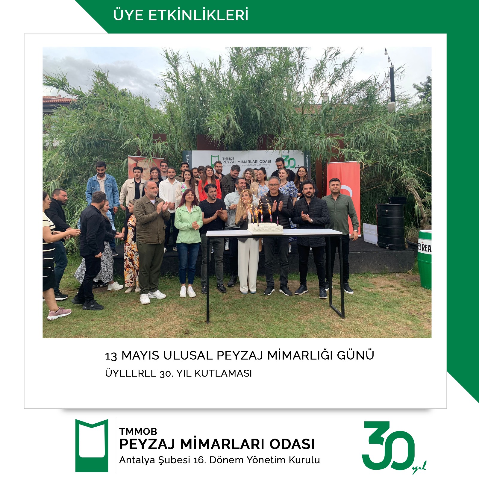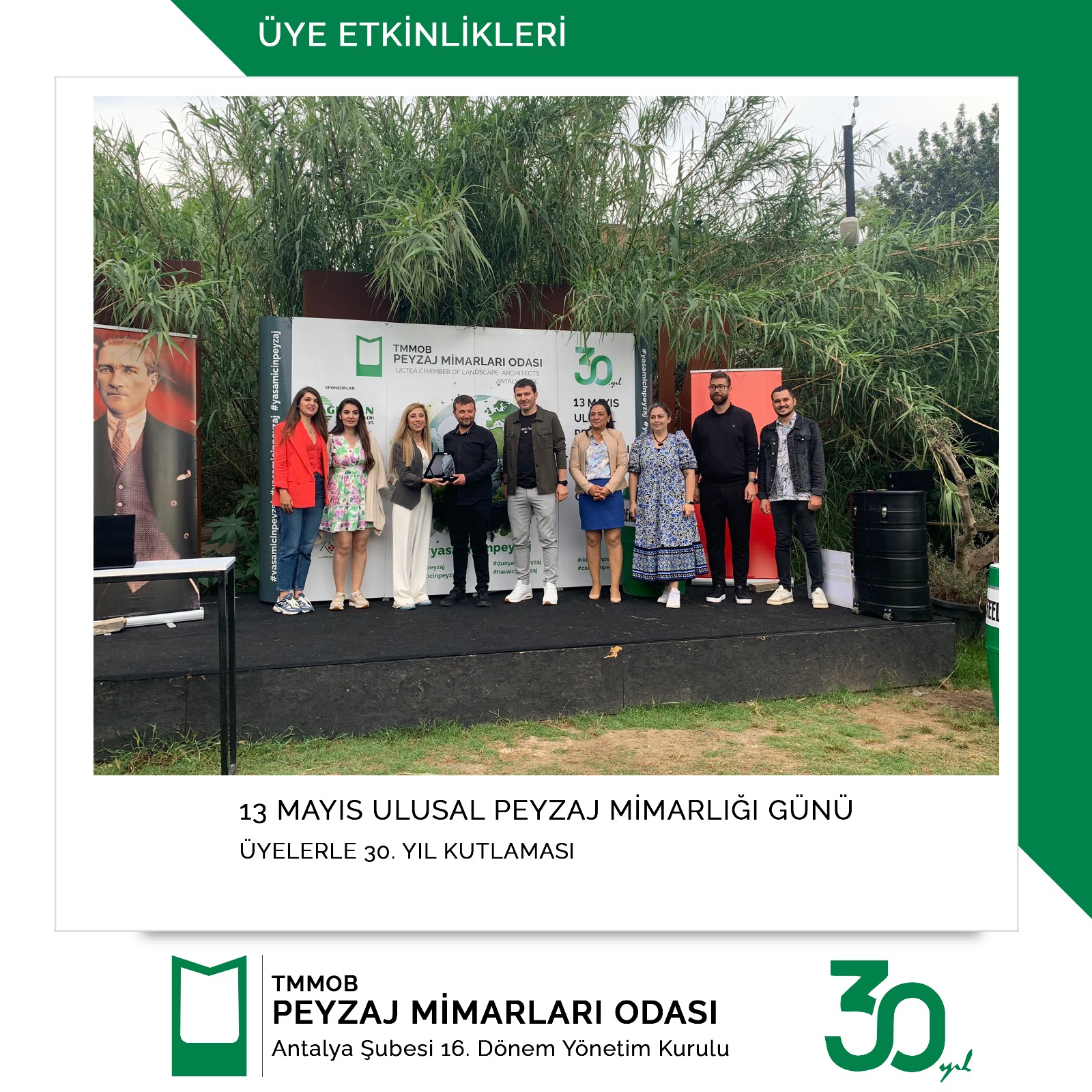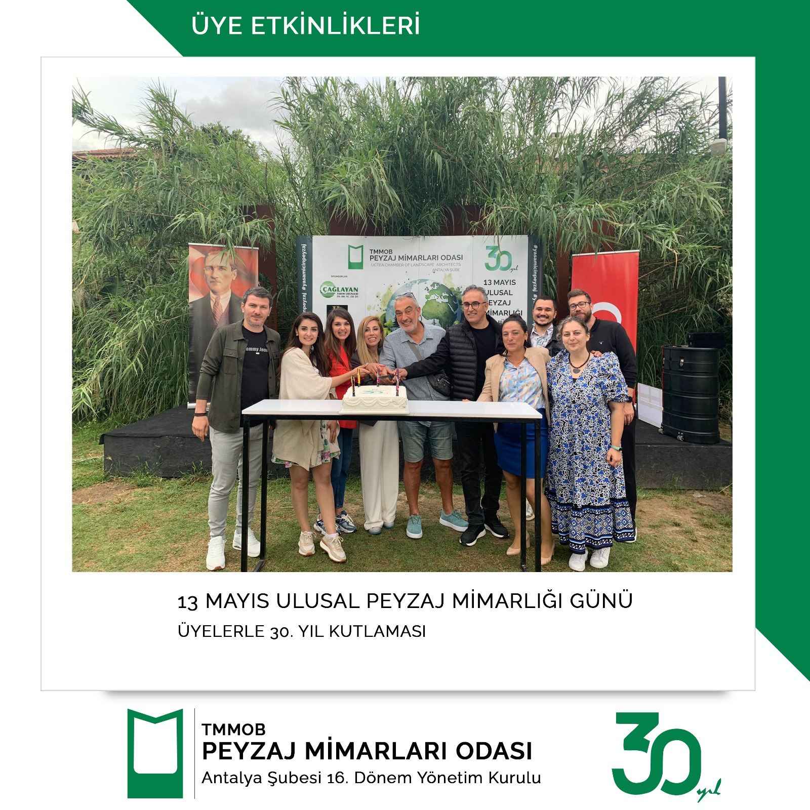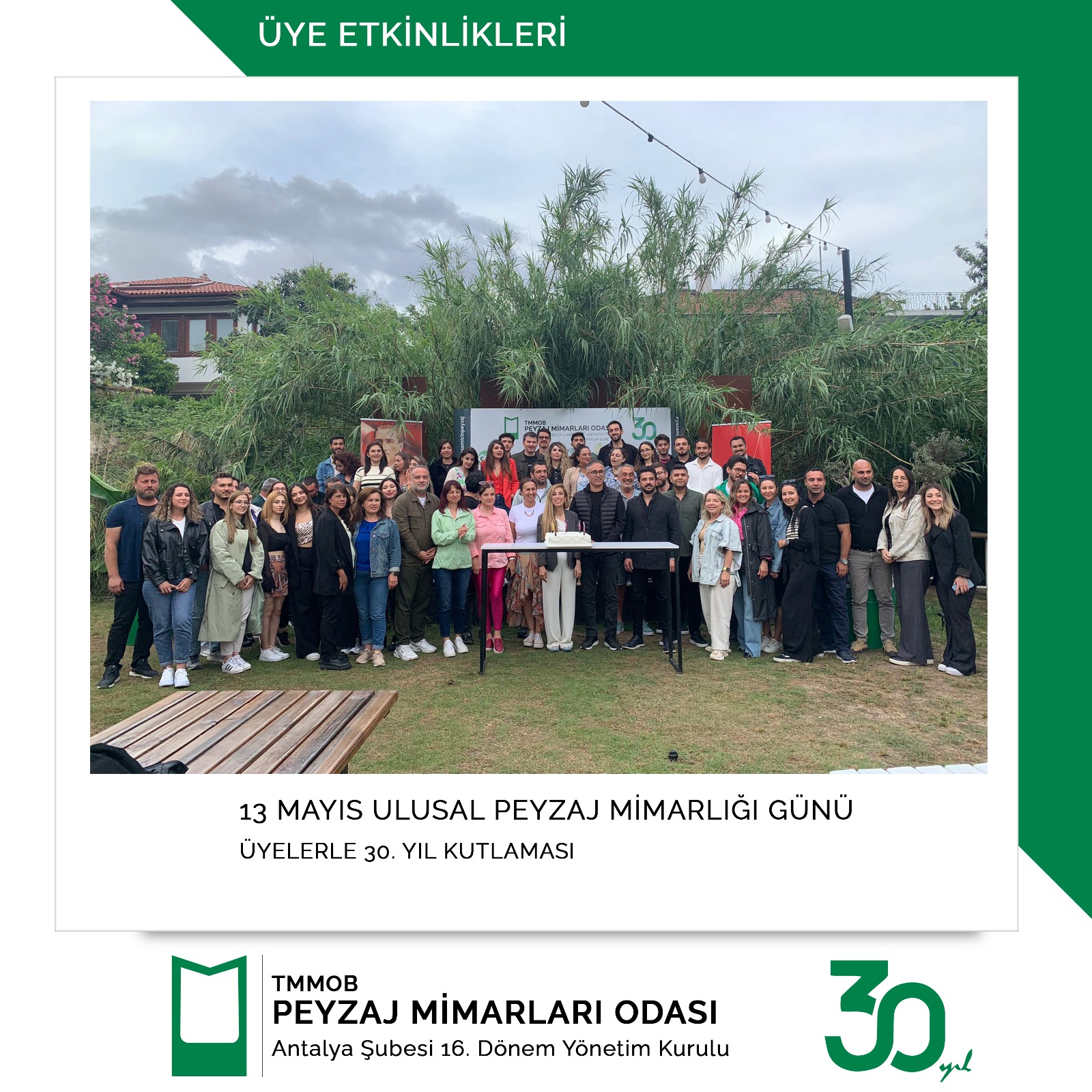 13 Mayıs Ulusal Peyzaj Mimarlığı Günü Etkinlikleri Kapsamında TMMOB Peyzaj Mimarları Odası Antalya Şubesi olarak 12 Mayıs 2024 Pazar günü Üyelerle 30. Yıl Kutlama Etkinliği düzenlenmiştir.