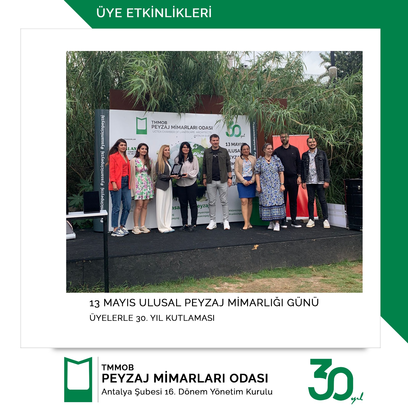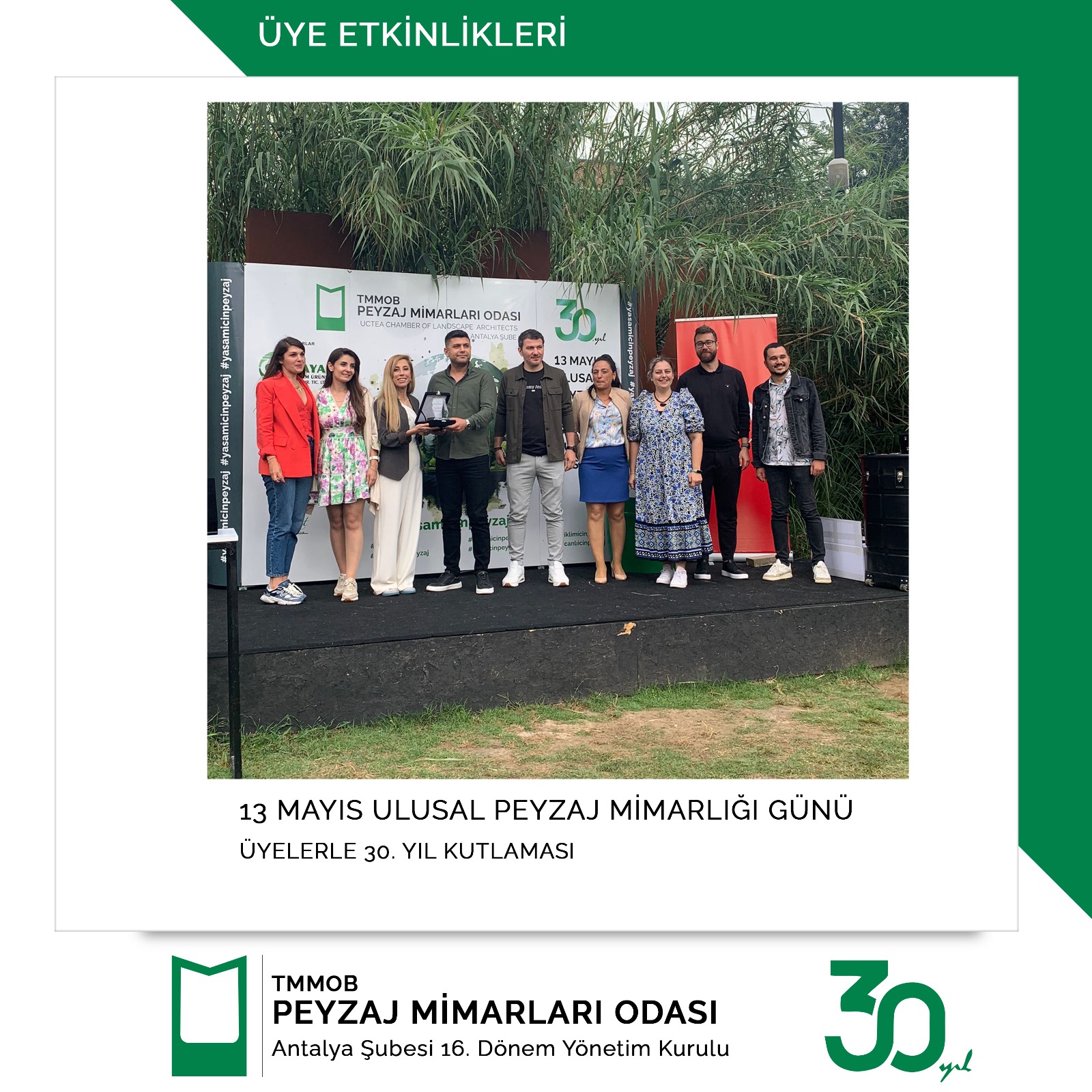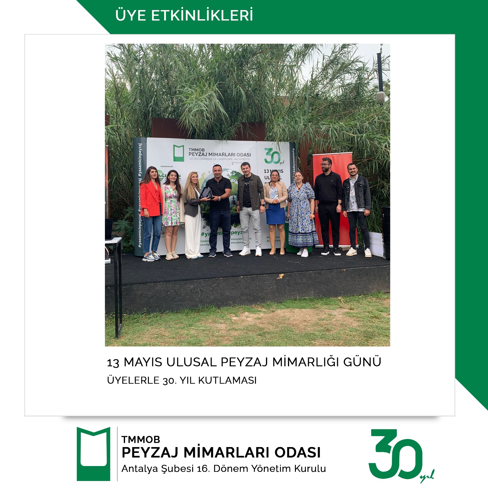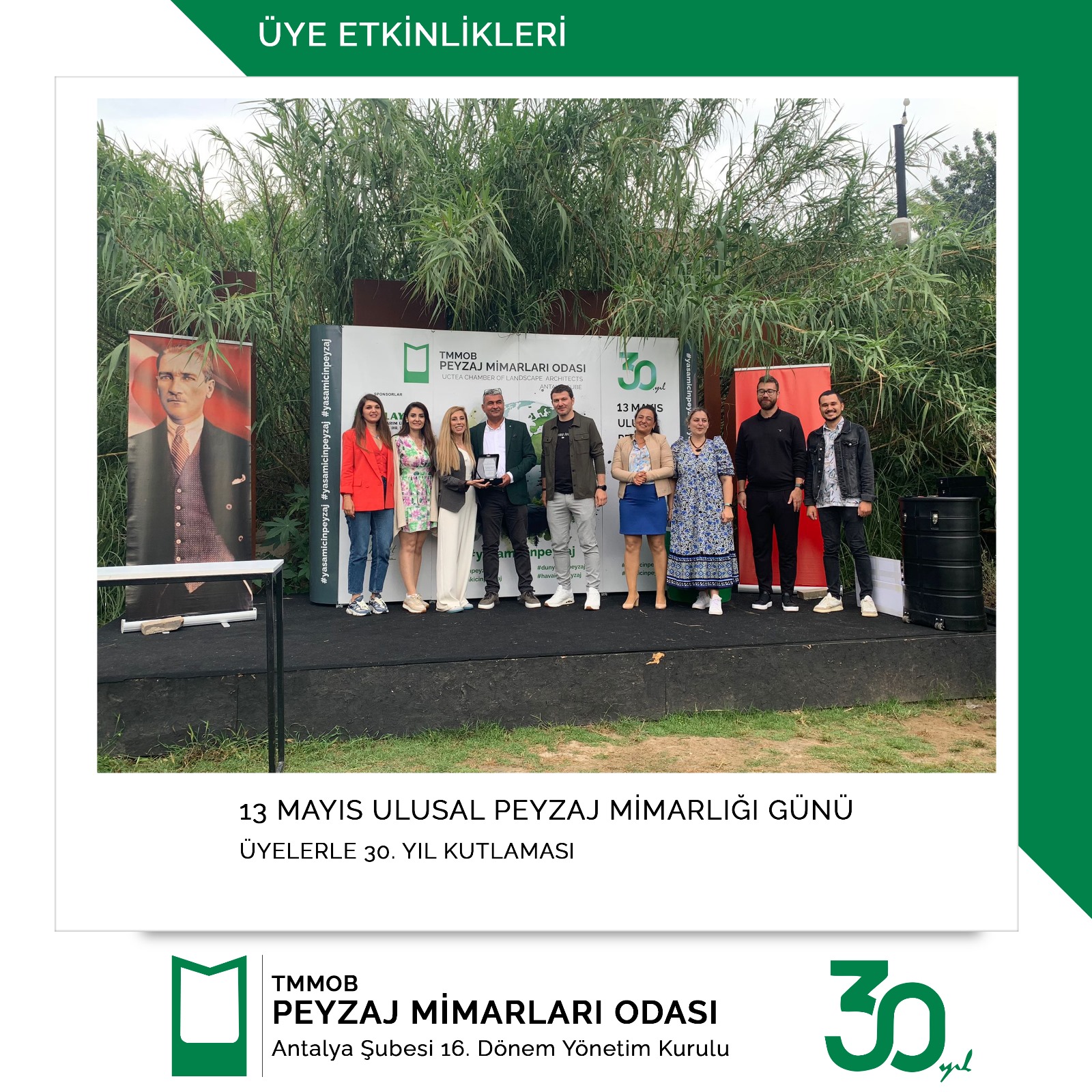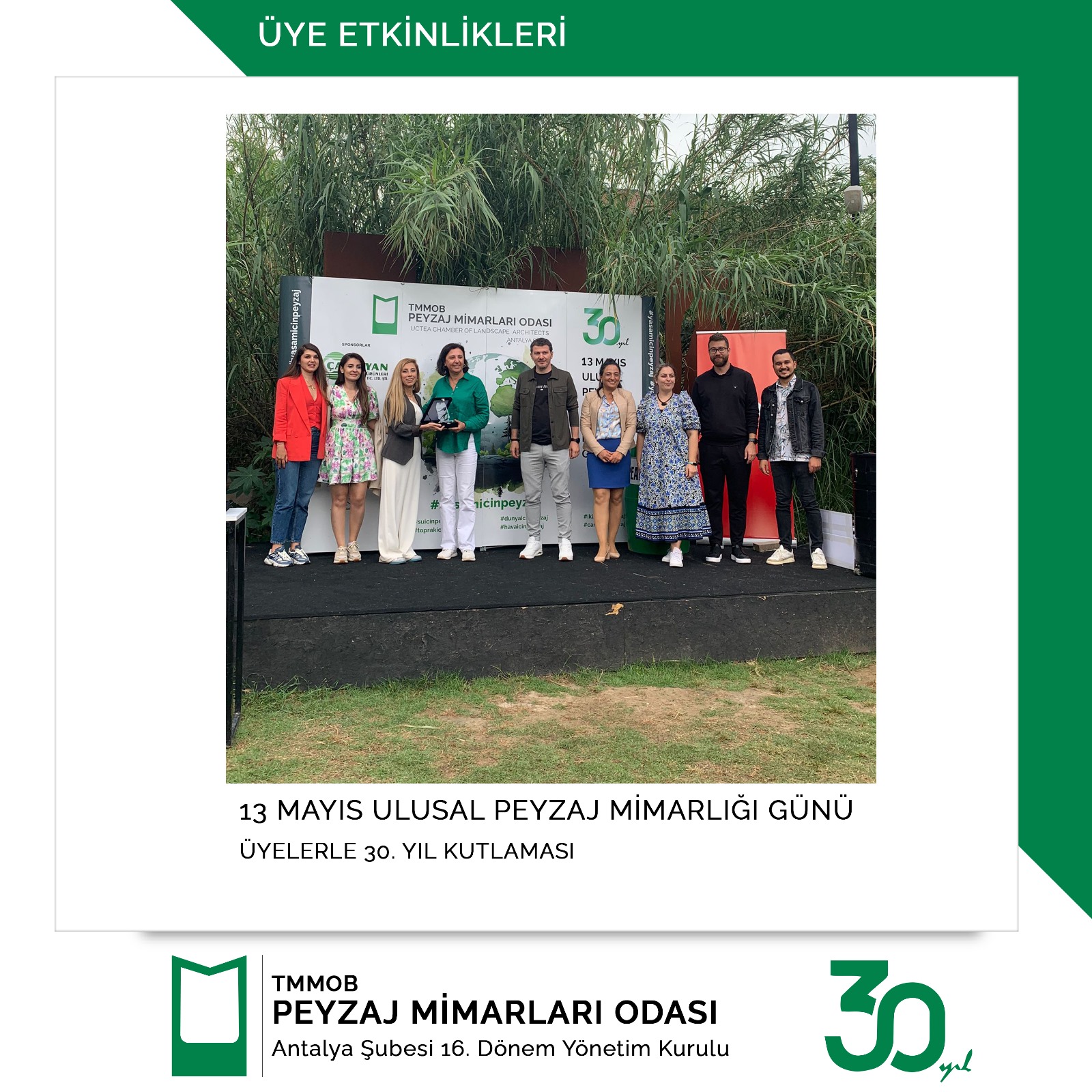13 Mayıs Ulusal Peyzaj Mimarlığı Günü Etkinlikleri Kapsamında TMMOB Peyzaj Mimarları Odası Antalya Şubesi olarak 12 Mayıs 2024 Pazar günü Üyelerle 30. Yıl Kutlama Etkinliği düzenlenmiştir.