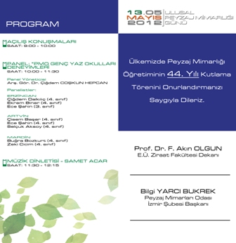 13 Mayıs "Ulusal Peyzaj Mimarlığı Günü ve Peyzaj Mimarlığı Öğretiminin 44. Yılı Kutlaması" etkinlikleri çerçevesinde Ege Üniversitesi Ziraat Fakültesi Mustafa Uluöz Bloku Feyzi Önder Konferans Salonu`nda gerçekleşecek etkinlik programı aşağıdadır. Etkinliğe tüm meslektaşlarımızın katılımını dileriz.
