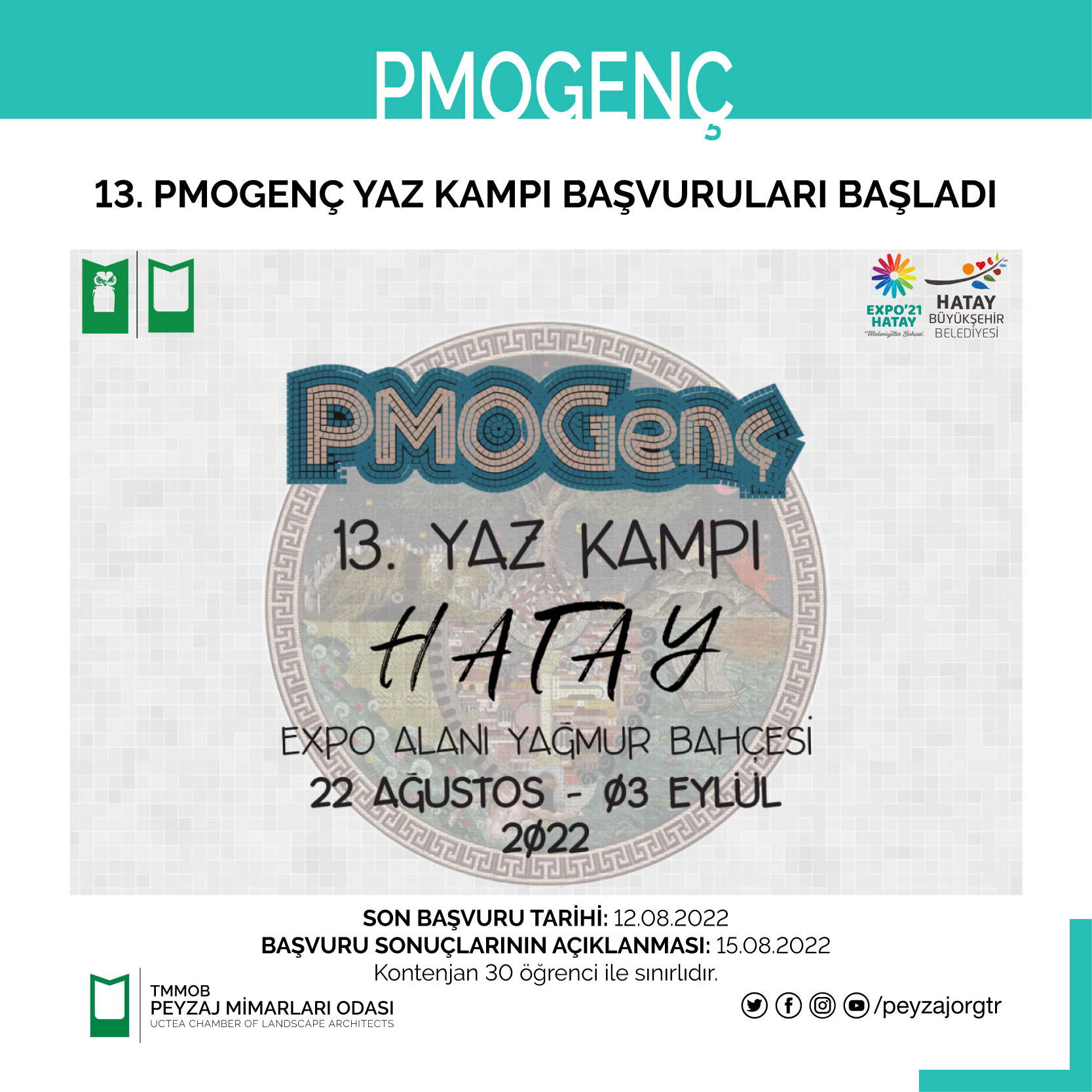 PMOGenç 13. Yaz Kampı, Hatay Büyükşehir Belediyesi ve Hatay EXPO 2021 Genel Sekreterliği işbirliği ile 22 Ağustos - 03 Eylül 2022 tarihleri arasında Hatay'da gerçekleşecektir.