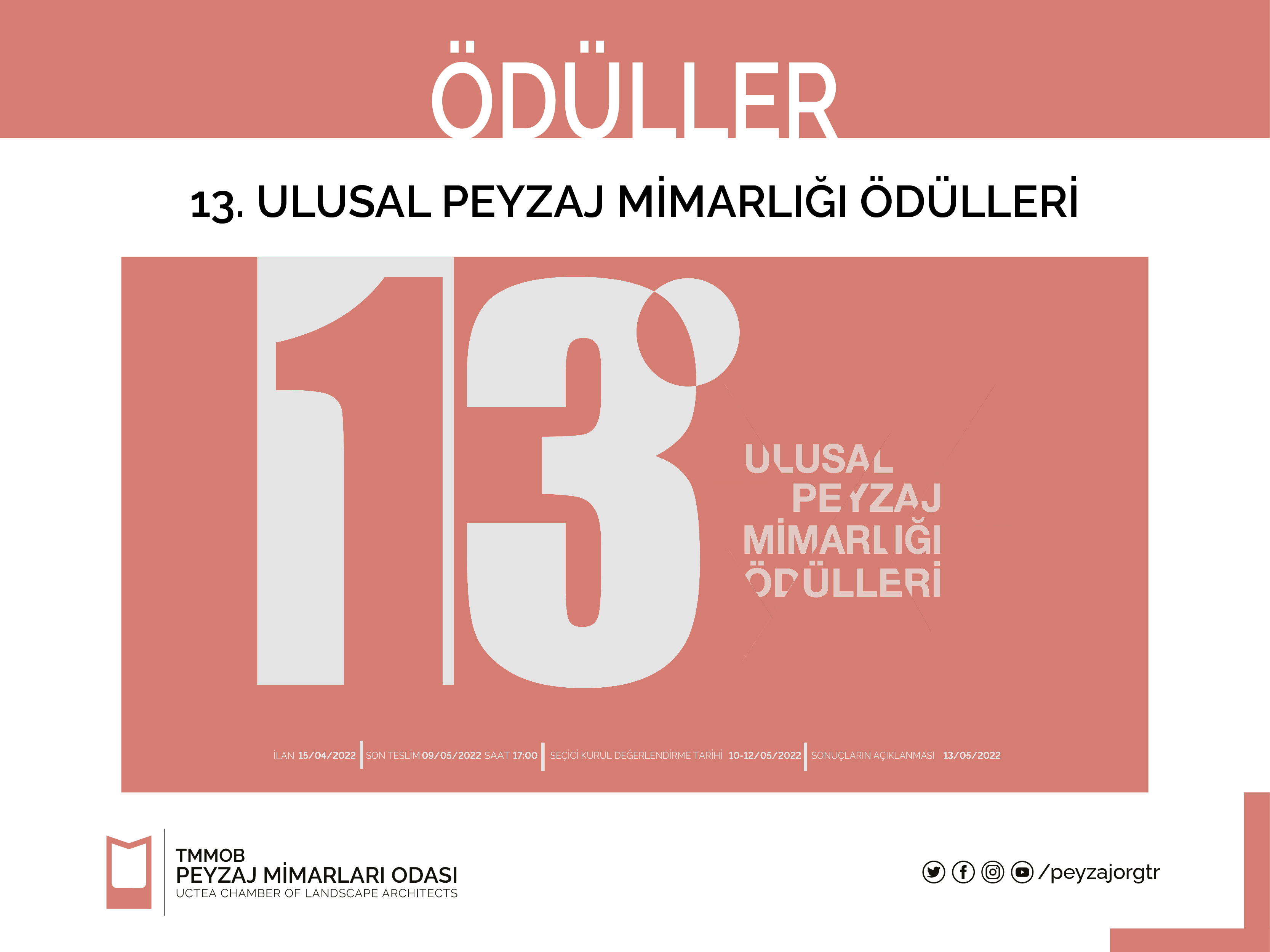 ÖNEMLİ: Katılımcıların/başvuru sahiplerinin; 9 Mayıs 2022 saat 17.00`a kadar, projelerini/başvurularını "13. Ulusal Peyzaj Mimarlığı Ödülleri" konu başlığı ile ulusal@peyzajmimoda.org.tr adresine dijital olarak iletmeleri gerekmektedir.