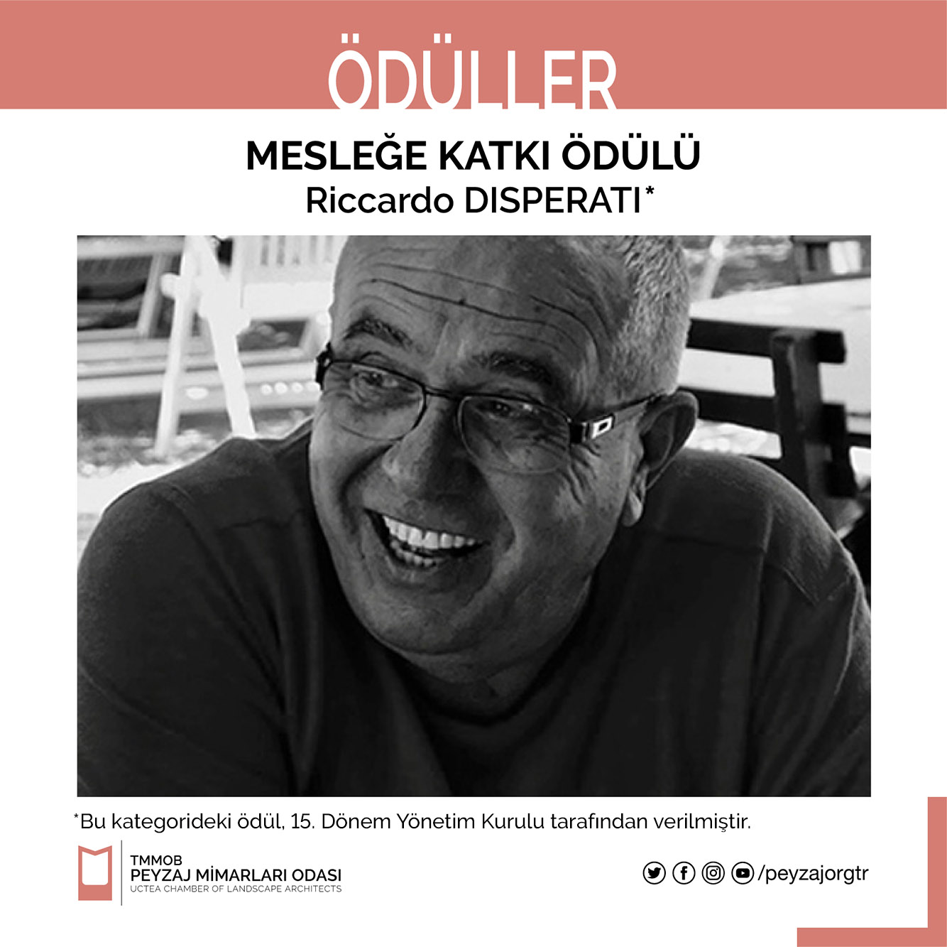 Mesleğimizin süs bitkileri alanındaki çalışmalarıyla mesleğin gelişimine katkıda bulunan ve 30 Kasım 2018de aramızdan ayrılan Riccardo DISPERATI`ye 15. Dönem Yönetim Kurulu tarafından Mesleğe Katkı Ödülü verilmesine karar verilmiştir.