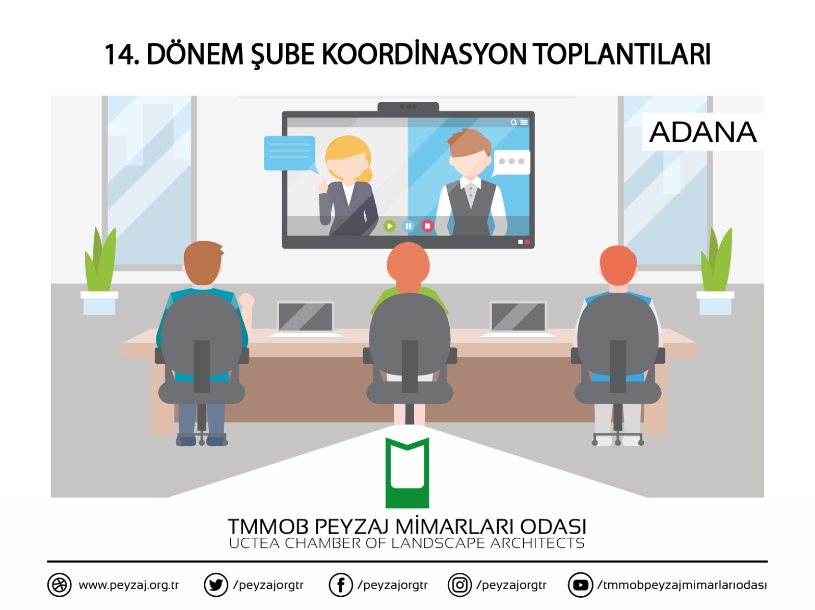 TMMOB Peyzaj Mimarları Odası 14. Dönem Yönetim Kurulu tarafından şubelerle yapılacak koordinasyon toplantılarının Adana ayağı 24 Kasım 2020 tarihinde çevrim içi olarak gerçekleştirildi. Toplantıda Şube faaliyetlerinin yanı sıra yakın ve uzun vadede gerçekleştirilecek çalışmalar görüşüldü.