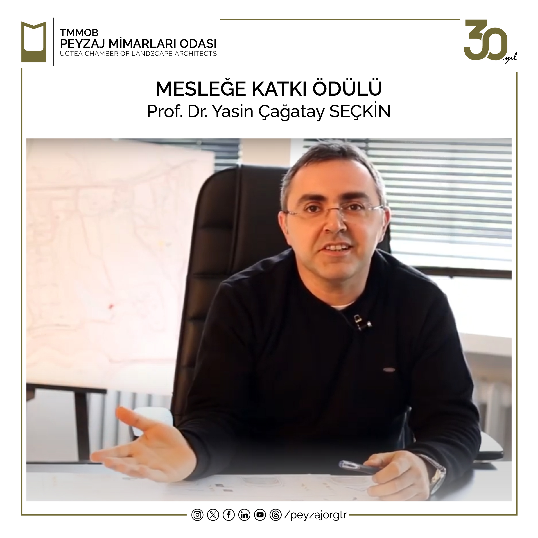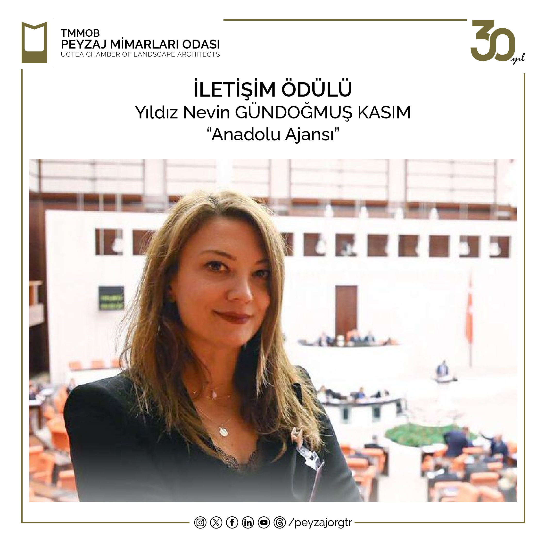 Son bir yılda; Odamızın ve mesleğimizin gelişimi adına basılı ve elektronik ortamda peyzaj mimarlığı konularına yer vermesi nedeniyle Sn. Yıldız Nevin KASIM`a 16. Dönem Yönetim Kurulu tarafından İletişim Ödülü verilmesine karar verilmiştir.