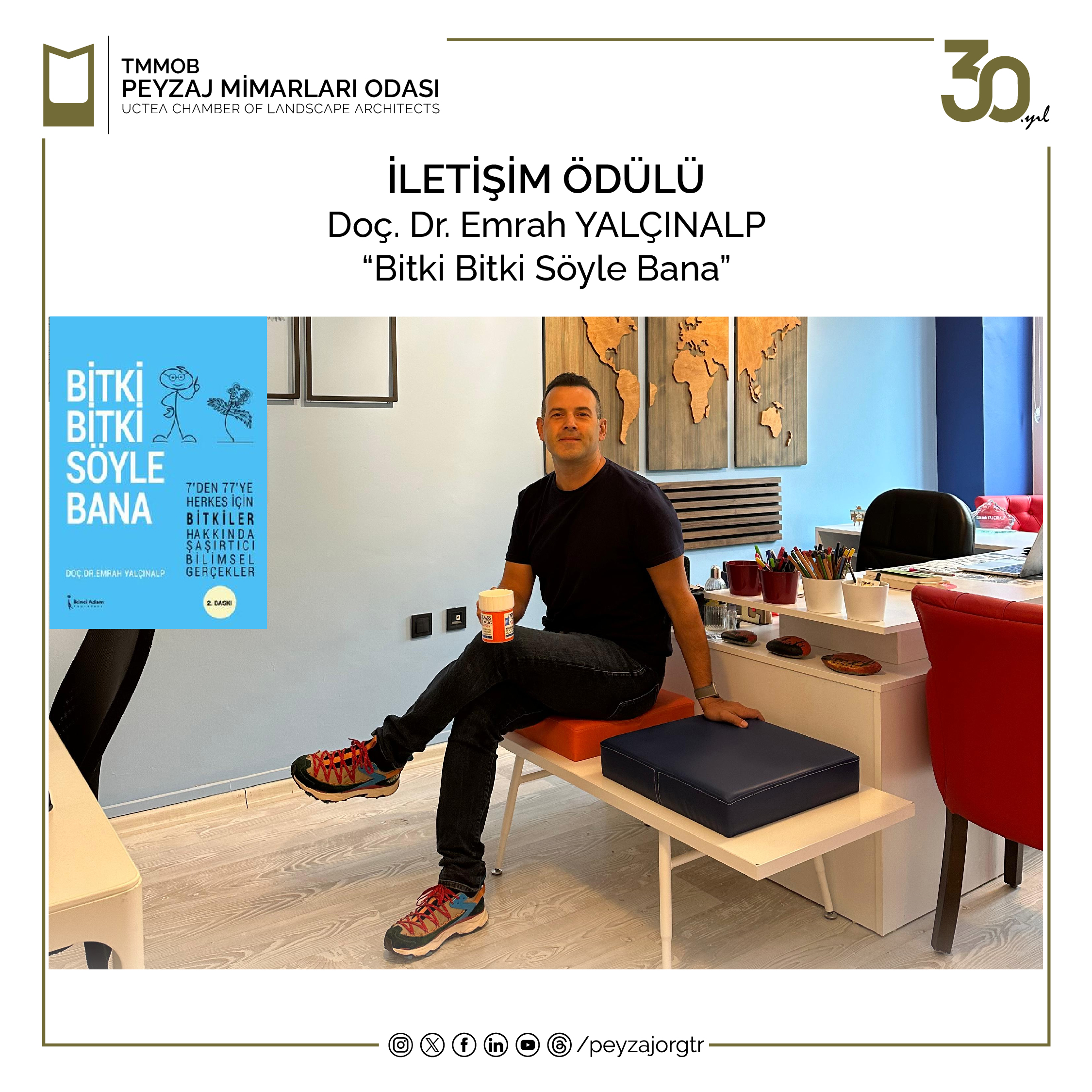 Mesleki ve akademik çalışmalarının yanı sıra yayımladığı “Bitki Bitki Söyle Bana” kitabı ile mesleğimizin gelişimi ve tanınırlığı adına sunmuş olduğu katkılar nedeniyle Sn. Doç. Dr. Emrah YALÇINALP`e 16. Dönem Yönetim Kurulu tarafından İletişim Ödülü verilmesine karar verilmiştir.