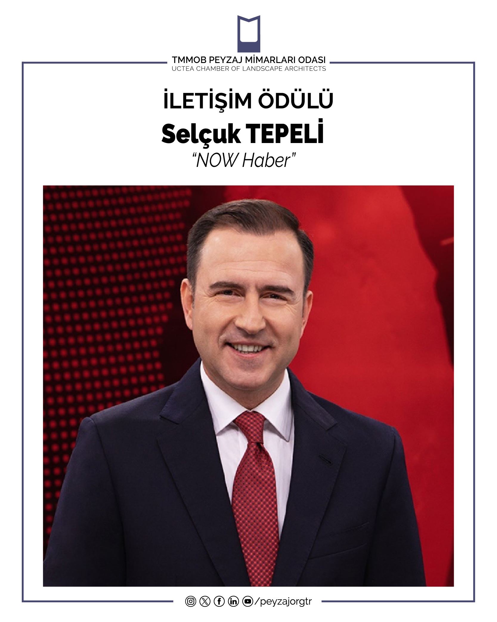 NOW TV'de yer alan Ana Haber bültenlerinde Odamızın ve mesleğimizin gelişimi adına peyzaj mimarlığı konularına yer vermesi ve 60. IFLA Dünya Kongresi’ne sunmuş olduğu katkılar nedeniyle Sn. Selçuk TEPELİ’ye 16. Dönem Yönetim Kurulu tarafından İletişim Ödülü verilmesine karar verilmiştir.