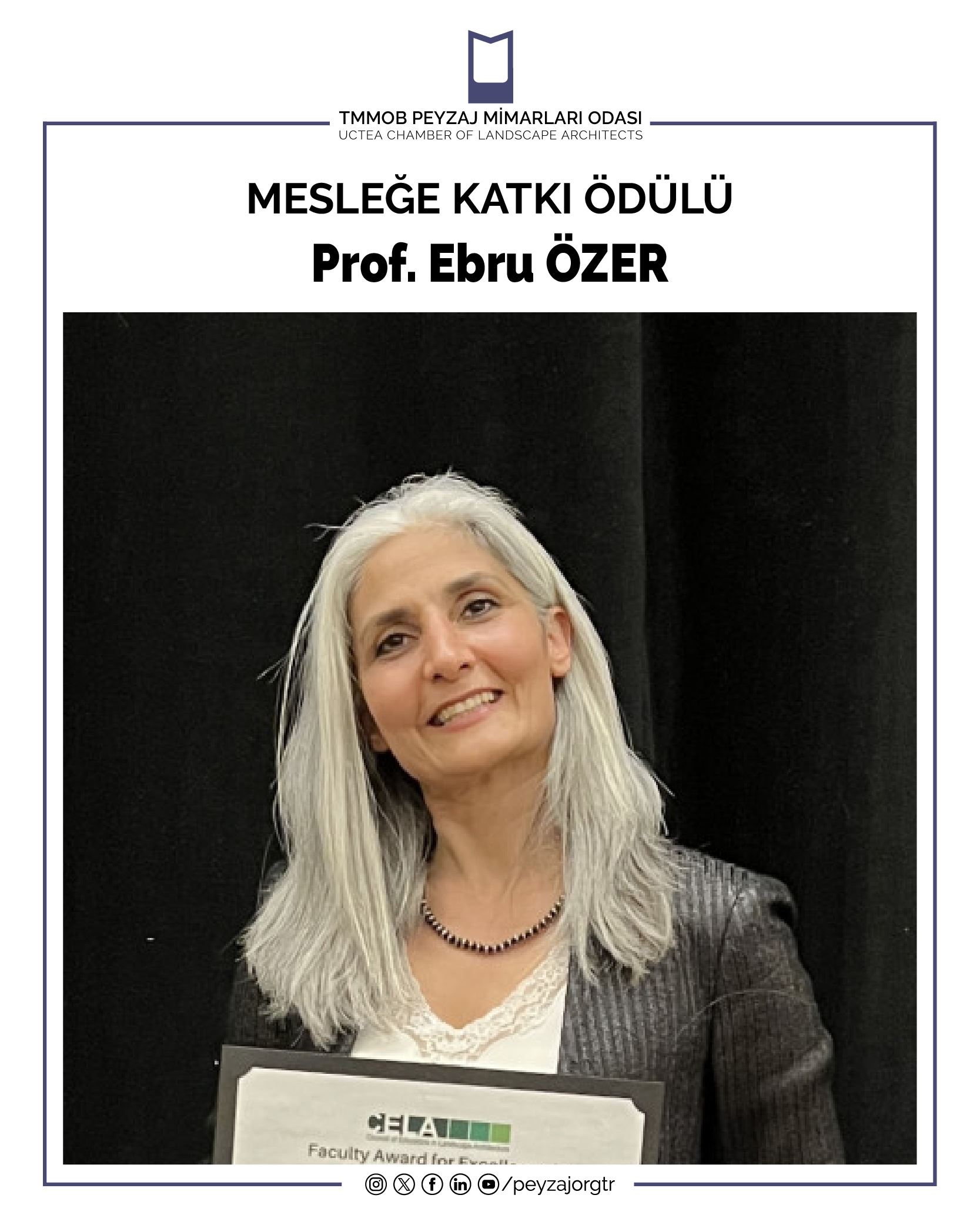 Mesleğimizin ve ülkemizin yurtdışında temsiline sunmuş olduğu önemli katkılarından dolayı Prof. Ebru ÖZER’e 16. Dönem Yönetim Kurulu tarafından Mesleğe Katkı Ödülü verilmesine karar verilmiştir.
