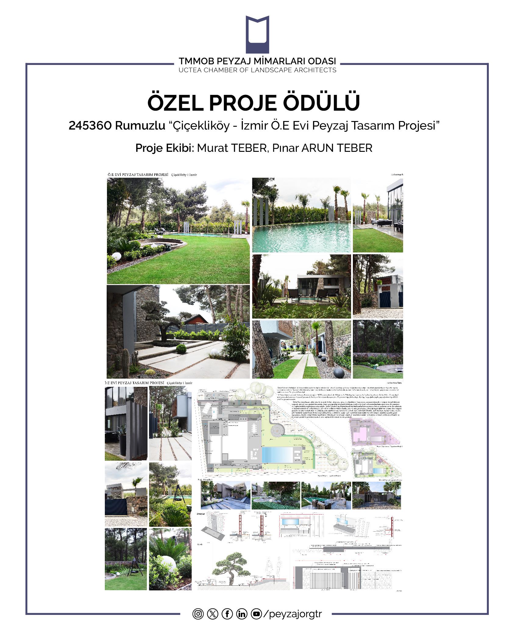 Asli Seçici Kurul Üyeleri Pınar KESİM AKTAŞ, Murat Zübeyir MEMLÜK, Zeynep ÖZEN, Özlem ŞENYOL, Emrah YALÇINALP, Özay YERLİKAYA, Tahsin YILMAZ ile Yedek Seçici Kurul Üyeleri Süleyman Can ÇİNKILIÇ, Tuğba KÜTÜK’ün katıldığı değerlendirme toplantısı 7 Mayıs 2025 Çarşamba günü gerçekleştirilerek, "Genel Kategori Proje", "Özel Proje", "Kentsel Tasarım", "Analiz ve Planlama", "Kamu Tarafından Gerçekleştirilen Peyzaj Tasarımında Sürdürülebilir Uygulamalar ve Projeler Ödülü", "Prof. Dr. Ümit ERDEM Genç Peyzaj Mimarı Ödülü" dallarında gönderilen başvurular, Seçici Kurul tarafından değerlendirilmiş ve ödüller belirlenmiştir. Değerlendirme toplantılarının Raportörlüğü Bilal Emre ARSLAN ve Hüseyin Burak SEVİM tarafından yapılmıştır.