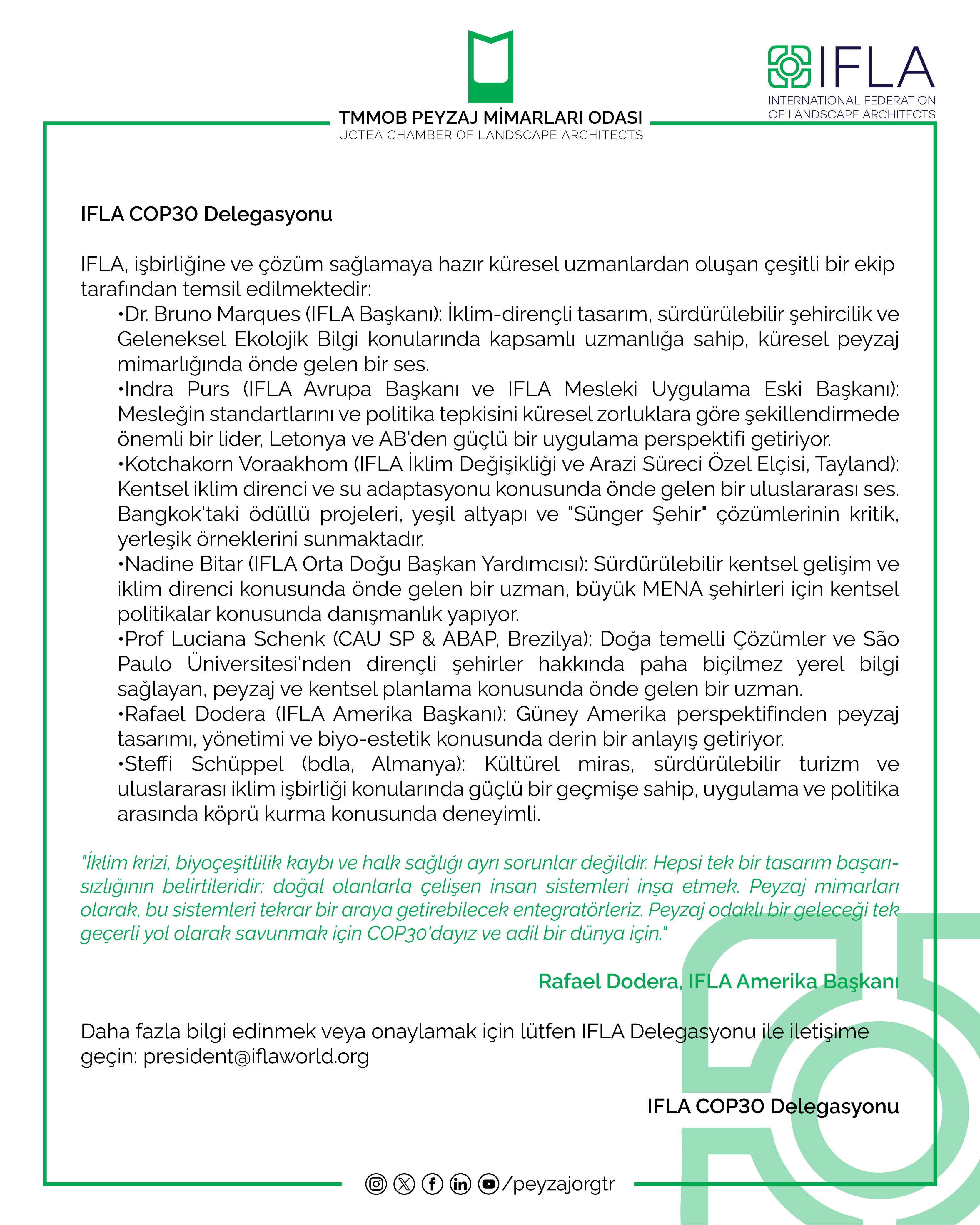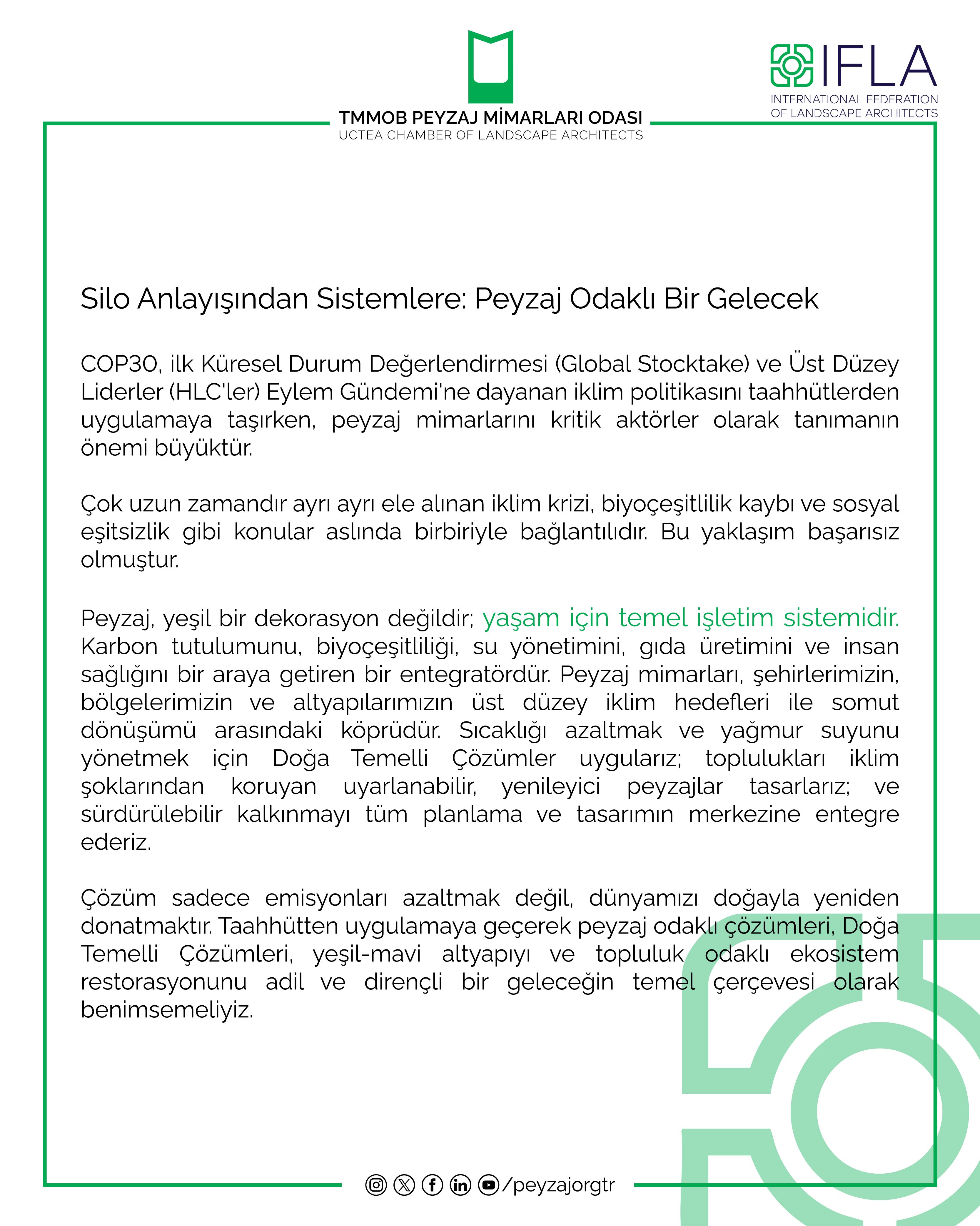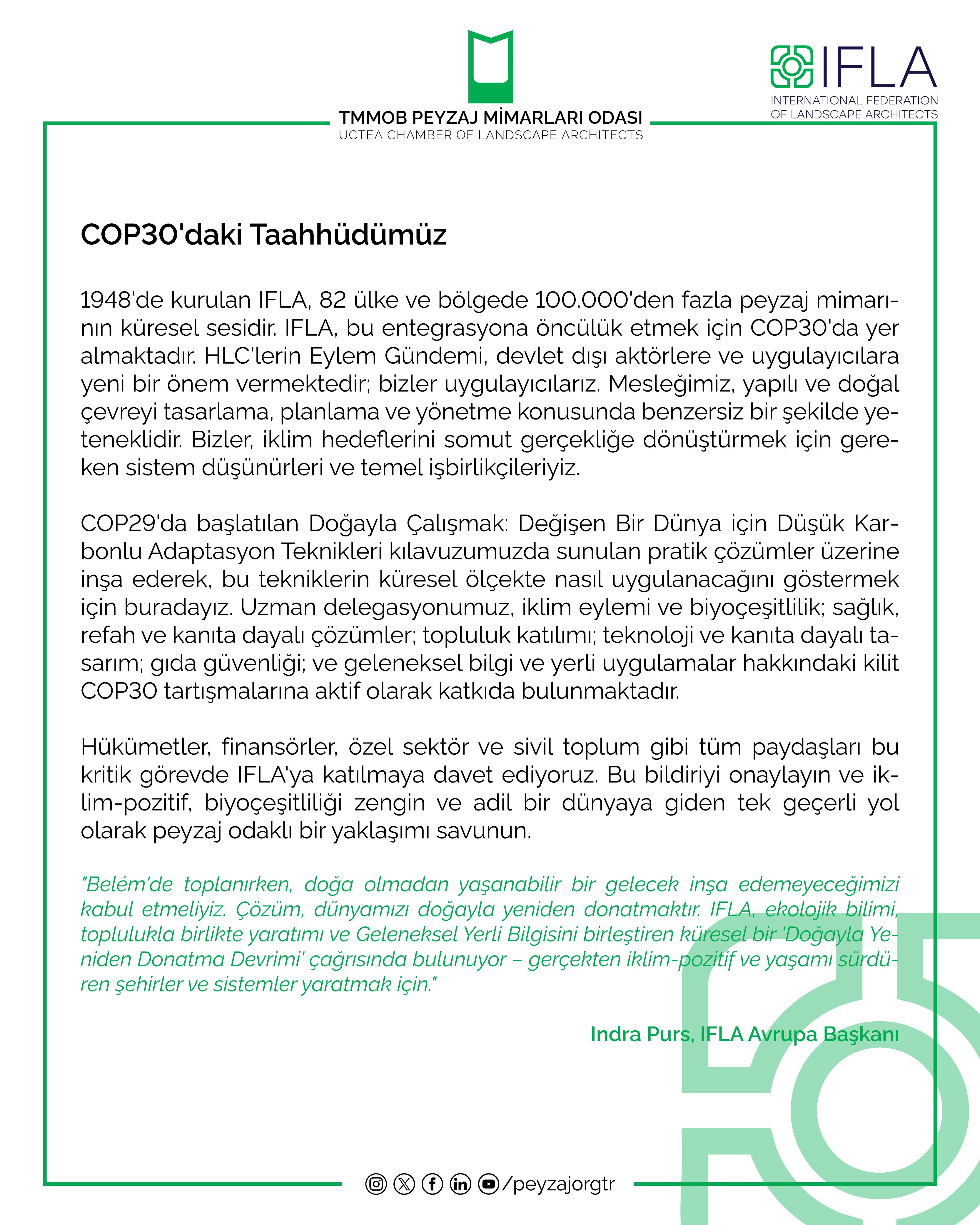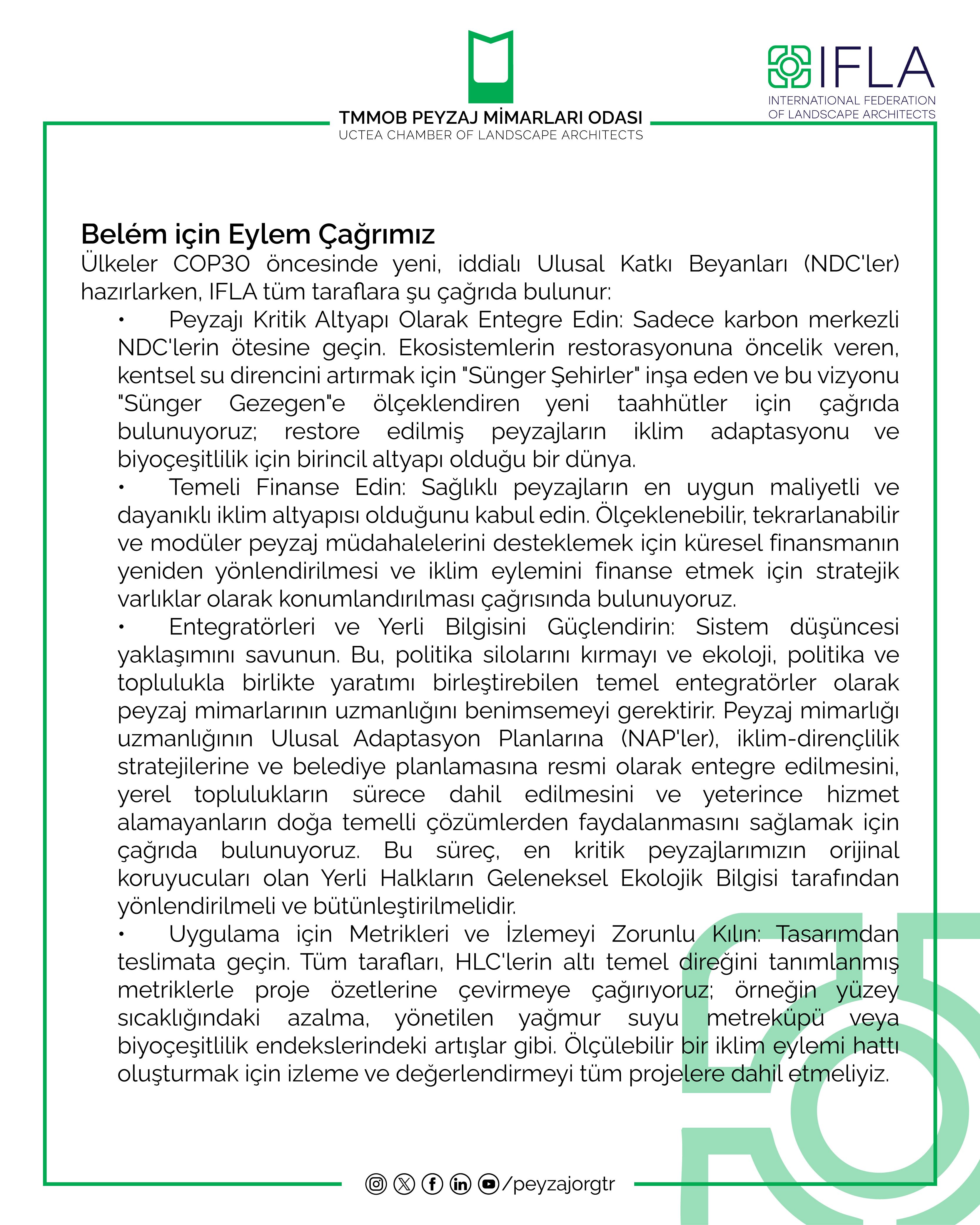 Uluslararası Çatı Örgütümüz IFLA tarafından Brezilya'nın Belém kentinde düzenlenecek olan COP30 İklim Zirvesi öncesinde "Peyzajı İklim Eyleminin Merkezine Koyun" başlıklı kapsamlı bir pozisyon bildirisi yayınladı.