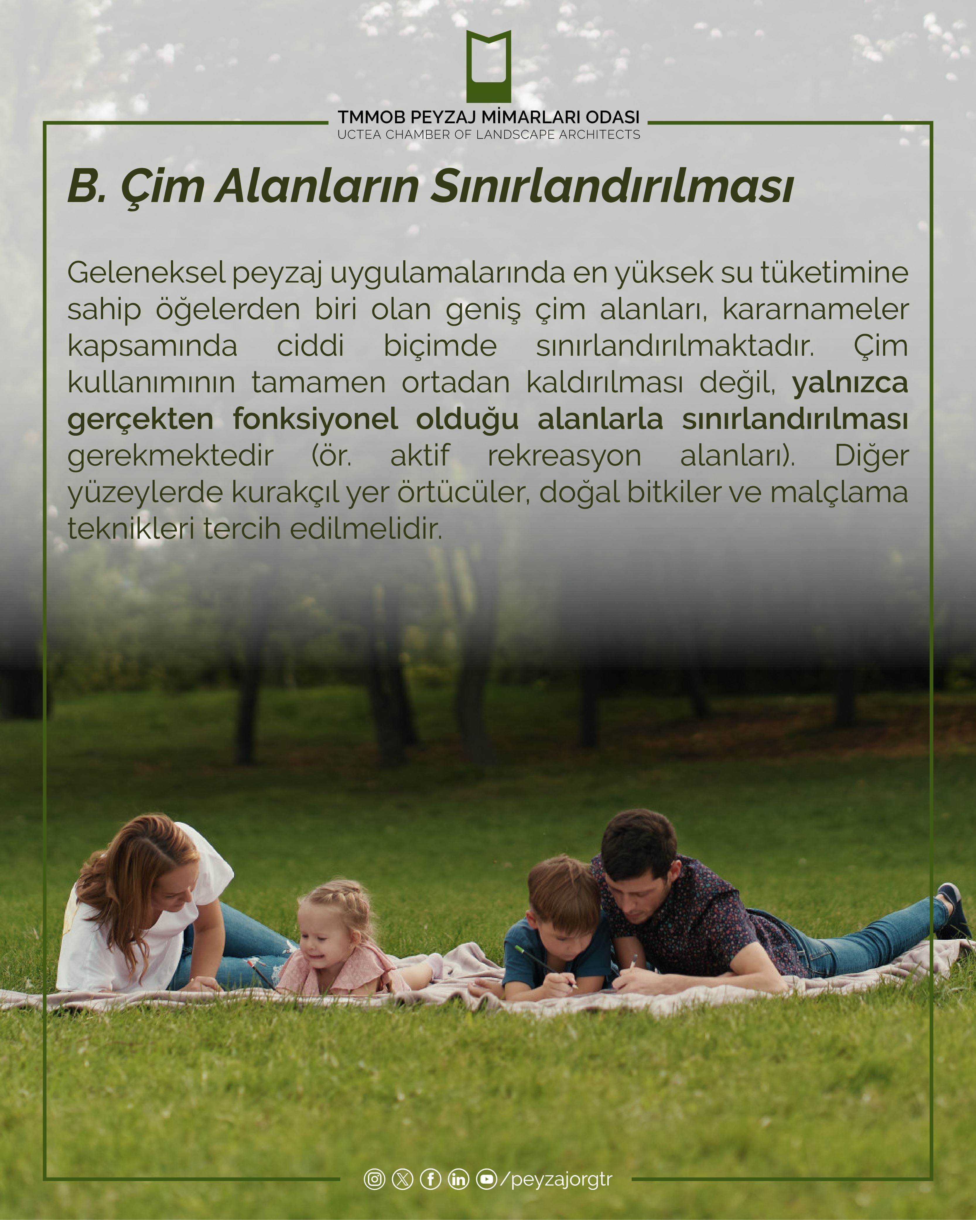 Geleneksel peyzaj uygulamalarında en yüksek su tüketimine sahip öğelerden biri olan geniş çim alanları, kararnameler kapsamında ciddi biçimde sınırlandırılmaktadır. Çim kullanımının tamamen ortadan kaldırılması değil, yalnızca gerçekten fonksiyonel olduğu alanlarla sınırlandırılması gerekmektedir (ör. aktif rekreasyon alanları). Diğer yüzeylerde kurakçıl yer örtücüler, doğal bitkiler ve malçlama teknikleri tercih edilmelidir.