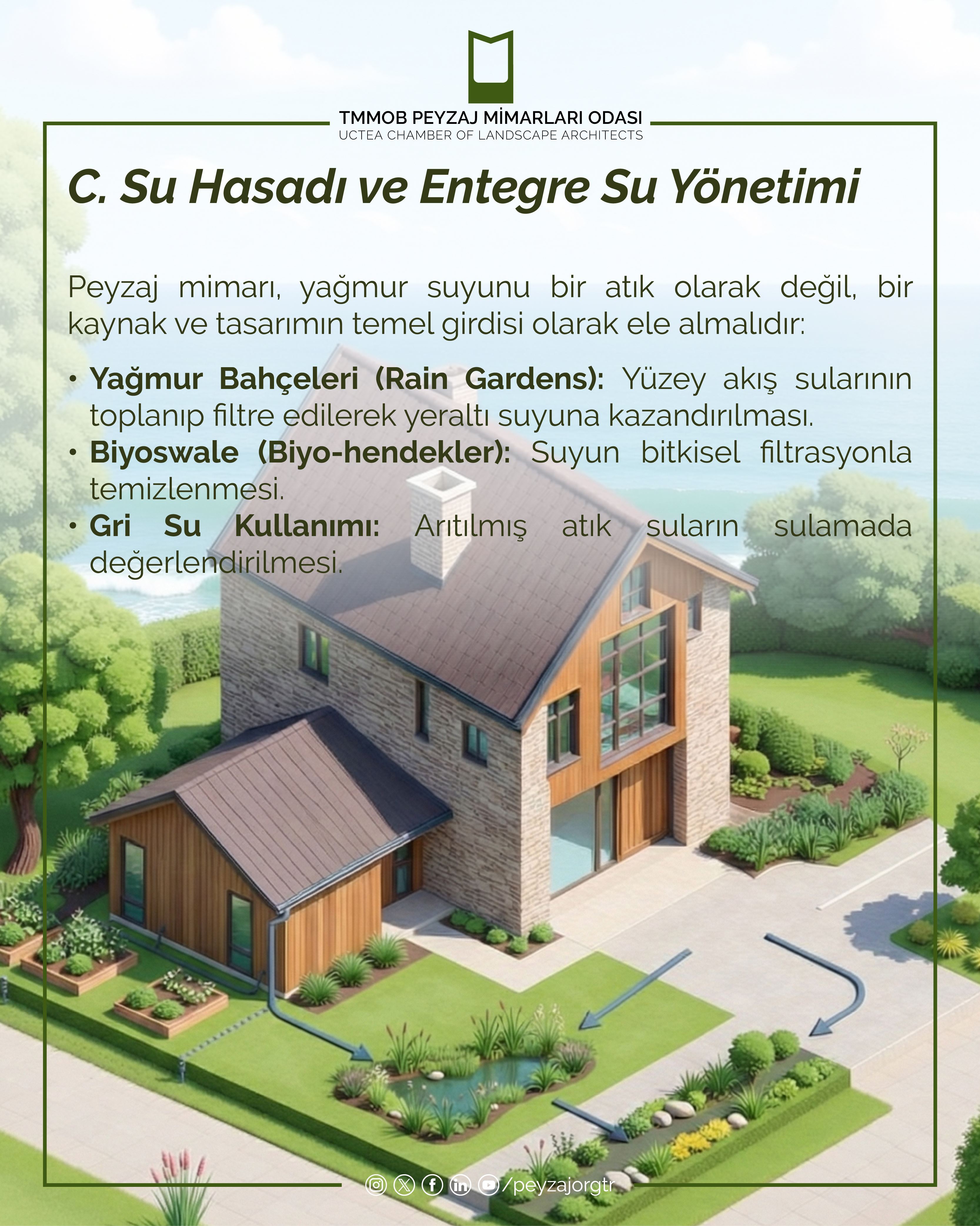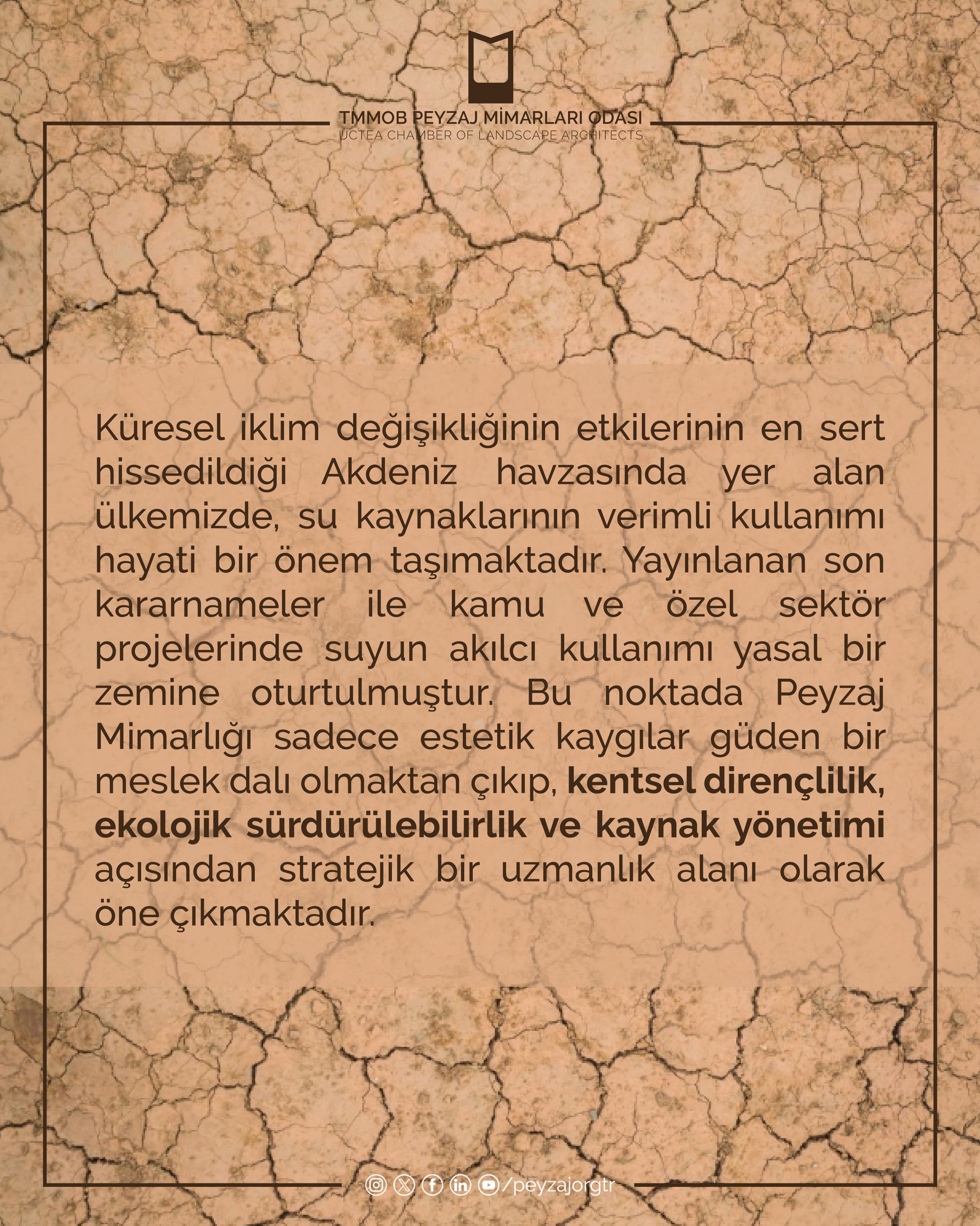Küresel iklim değişikliğinin etkilerinin en sert hissedildiği Akdeniz havzasında yer alan ülkemizde, su kaynaklarının verimli kullanımı hayati bir önem taşımaktadır. Yayınlanan son kararnameler ile kamu ve özel sektör projelerinde suyun akılcı kullanımı yasal bir zemine oturtulmuştur. Bu noktada Peyzaj Mimarlığı sadece estetik kaygılar güden bir meslek dalı olmaktan çıkıp, kentsel dirençlilik, ekolojik sürdürülebilirlik ve kaynak yönetimi açısından stratejik bir uzmanlık alanı olarak öne çıkmaktadır.