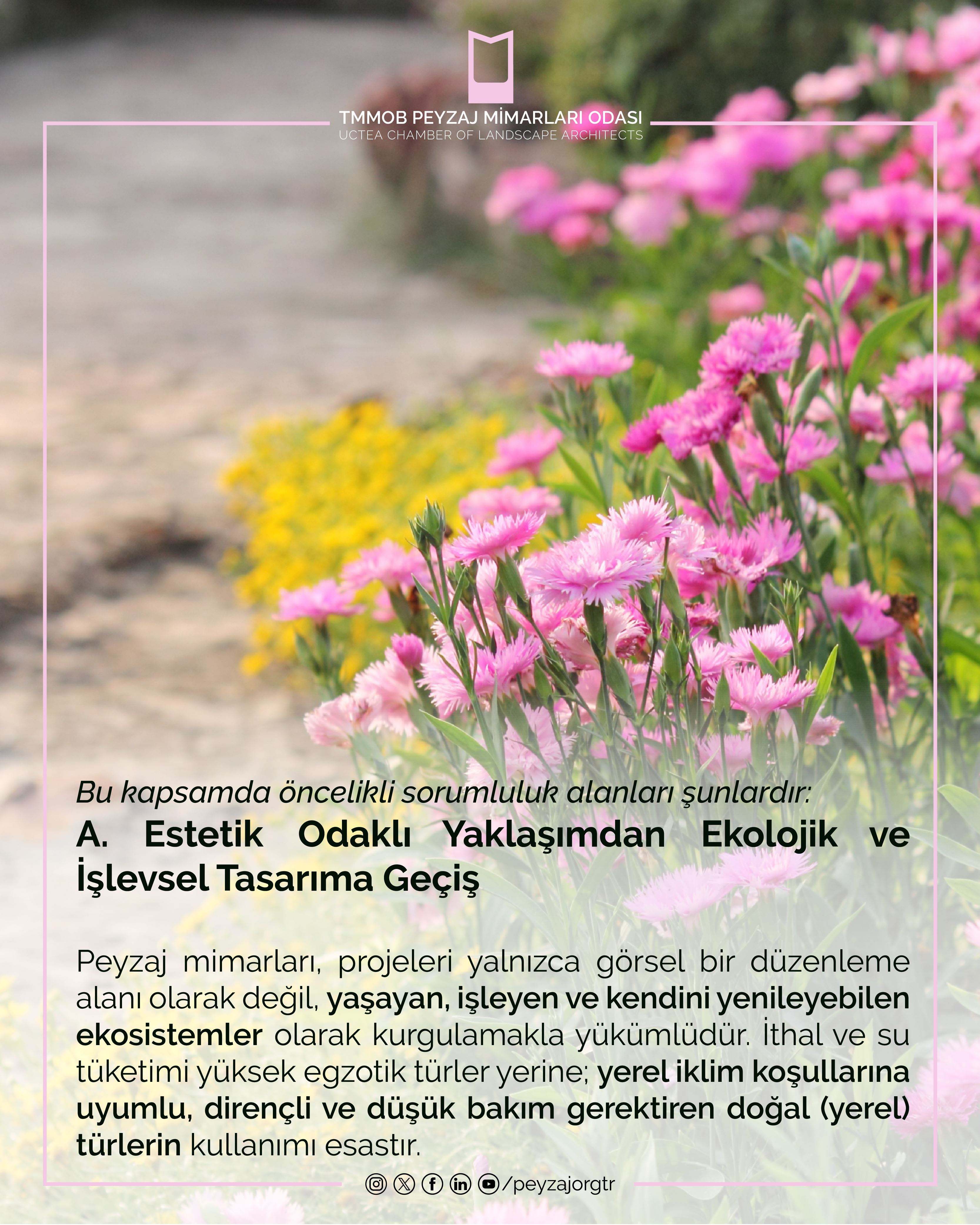 Peyzaj mimarları, projeleri yalnızca görsel bir düzenleme alanı olarak değil, yaşayan, işleyen ve kendini yenileyebilen ekosistemler olarak kurgulamakla yükümlüdür. İthal ve su tüketimi yüksek egzotik türler yerine; yerel iklim koşullarına uyumlu, dirençli ve düşük bakım gerektiren doğal (yerel) türlerin kullanımı esastır.