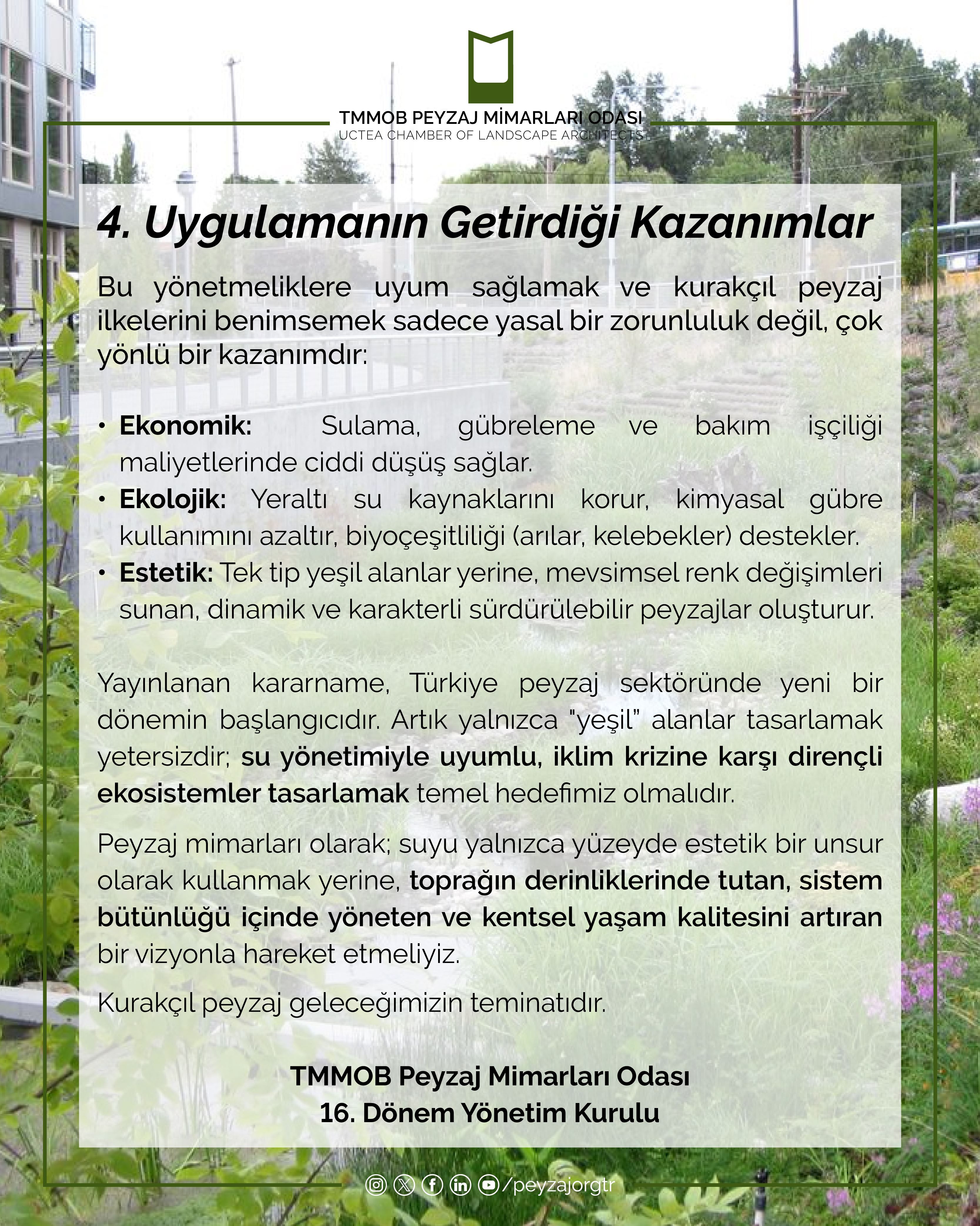 Yayınlanan kararname, Türkiye peyzaj sektöründe yeni bir dönemin başlangıcıdır.. Artık yalnızca "yeşil” alanlar tasarlamak yetersizdir; su yönetimiyle uyumlu, iklim krizine karşı dirençli ekosistemler tasarlamak temel hedefimiz olmalıdır.