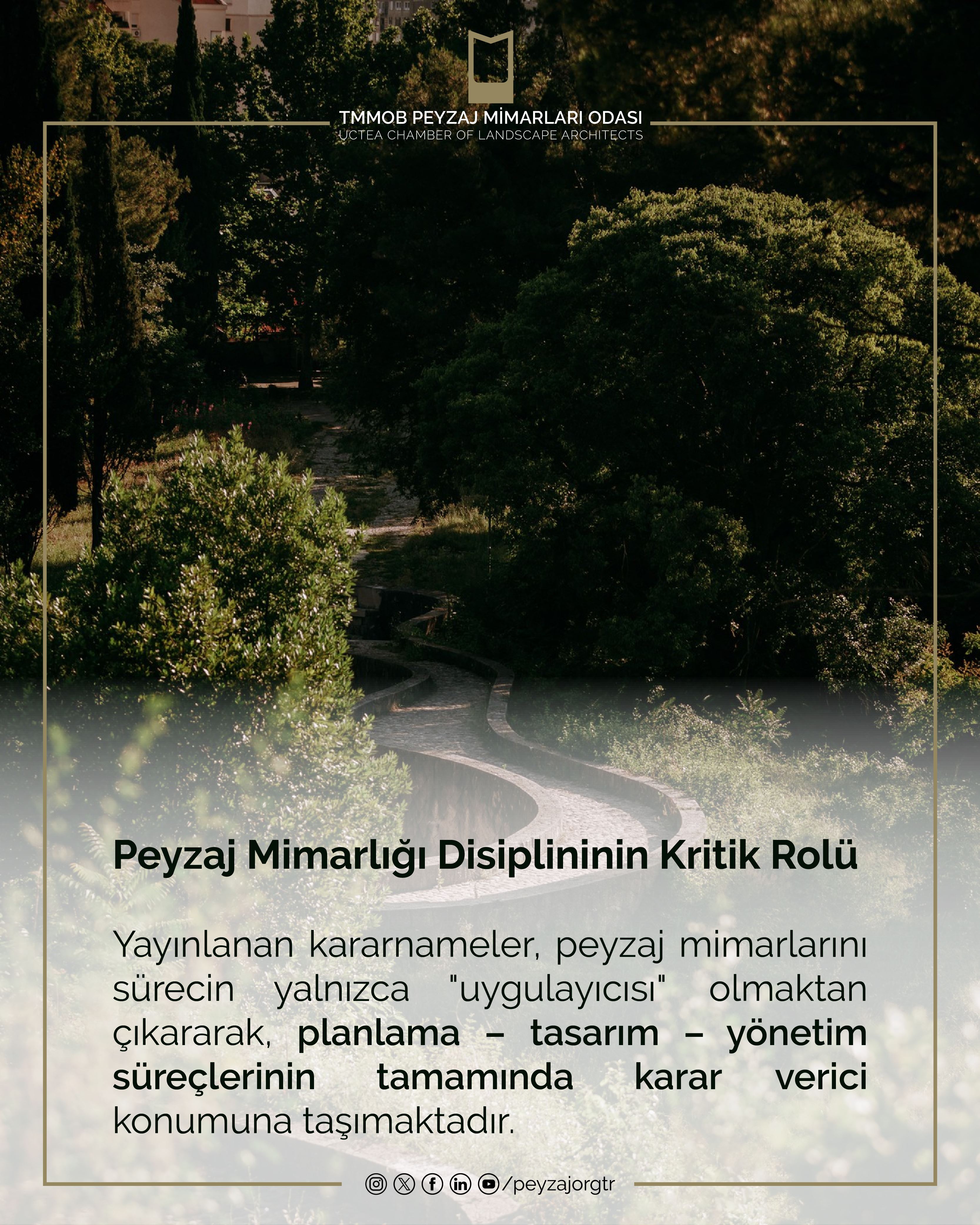 Yayınlanan kararnameler, peyzaj mimarlarını sürecin yalnızca "uygulayıcısı" olmaktan çıkararak, planlama–tasarım–yönetim süreçlerinin tamamında karar verici konumuna taşımaktadır. Bu kapsamda öncelikli sorumluluk alanları şunlardır: