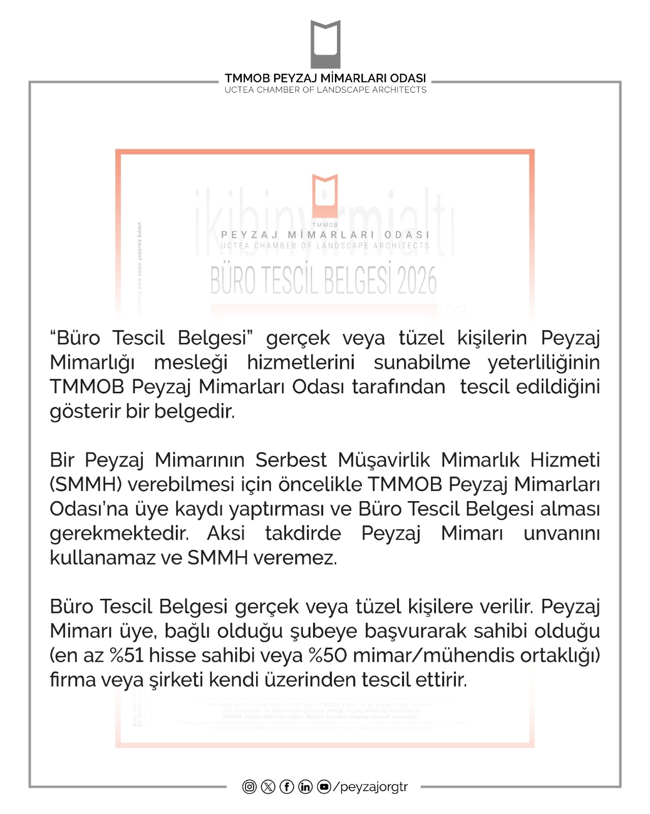 Bu sebeple ticari olarak HER TÜRLÜ peyzaj mimarlığı faaliyeti yürüten üyelerimizin, 2026 yılı SMM-BTB dosya yenileme işlemlerinin 31 Ocak 2026 tarihine kadar tamamlaması gerekmektedir. Bu tarihten sonra yapılan yenileme işlemlerinde, SMM Büro Tescil Belgesi (BTB) ilk başvuru ücretinin ödenmesi gerektiğini belirtiriz.