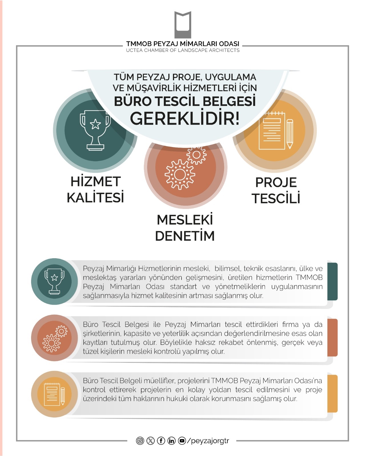 TMMOB Peyzaj Mimarları Odası Serbest Peyzaj Mimarlık Müşavirlik Hizmetleri Uygulama, Meslekî Denetim, Büroların Tescili ve Asgarî Ücret Yönetmeliği‘nin 15. Maddesinin f bendinde "Serbest peyzaj mimarlığı hizmetleri büro tescil belgesi her yıl Ocak ayı sonuna kadar, serbest peyzaj mimarının yazılı başvurusu ile o yıl sonuna dek geçerli olmak üzere yenilenir. Tescil yenileme ücreti ve o yılın üyelik aidatı tam olarak alınır. Belirlenmiş süresi içerisinde tescil yenilemesi yapılmamış ise yenileme işlemi yapılırken ilk tescil ücreti ve o yılın üyelik aidatı alınır." denilmektedir.