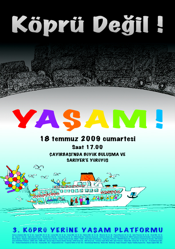 Mart 2008‘den buyana dün; Havantepe‘de, Sarıyer merkezde, Rumelikavağı‘nda, Tarabya‘da, Beykoz‘daydık. "3.rant köprüsü" söylentilerinden vazgeçilinceye kadar, bundan sonra da gerekirse Türkiye‘nin tüm meydanlarını dolaşarak mücadelemizi sürdüreceğiz, İstanbul halkına, kente, çevreye ve doğaya karşı suç işlenmesini, ülkenin parasal kaynaklarının çarçur edilmesini önleyeceğiz.