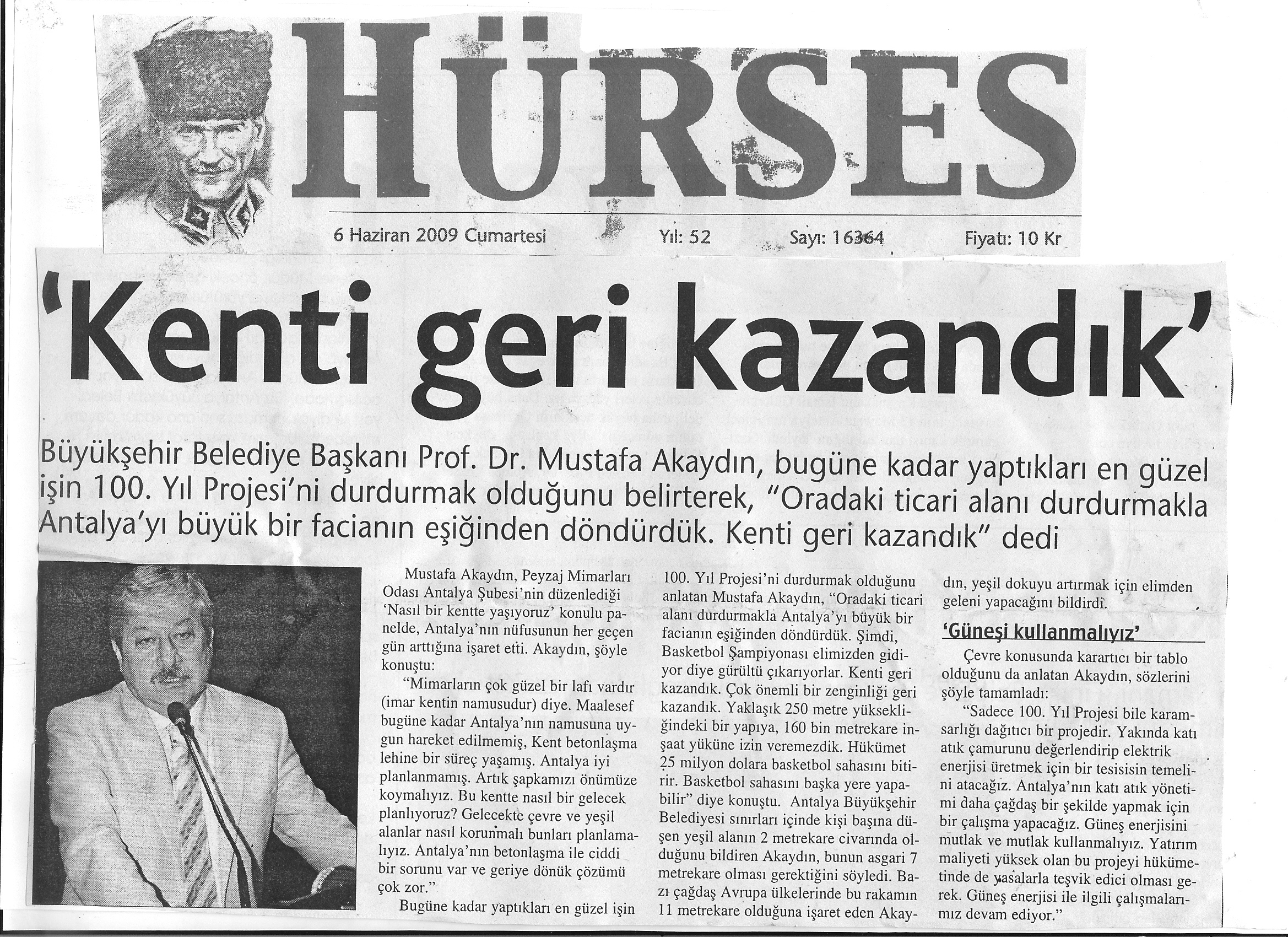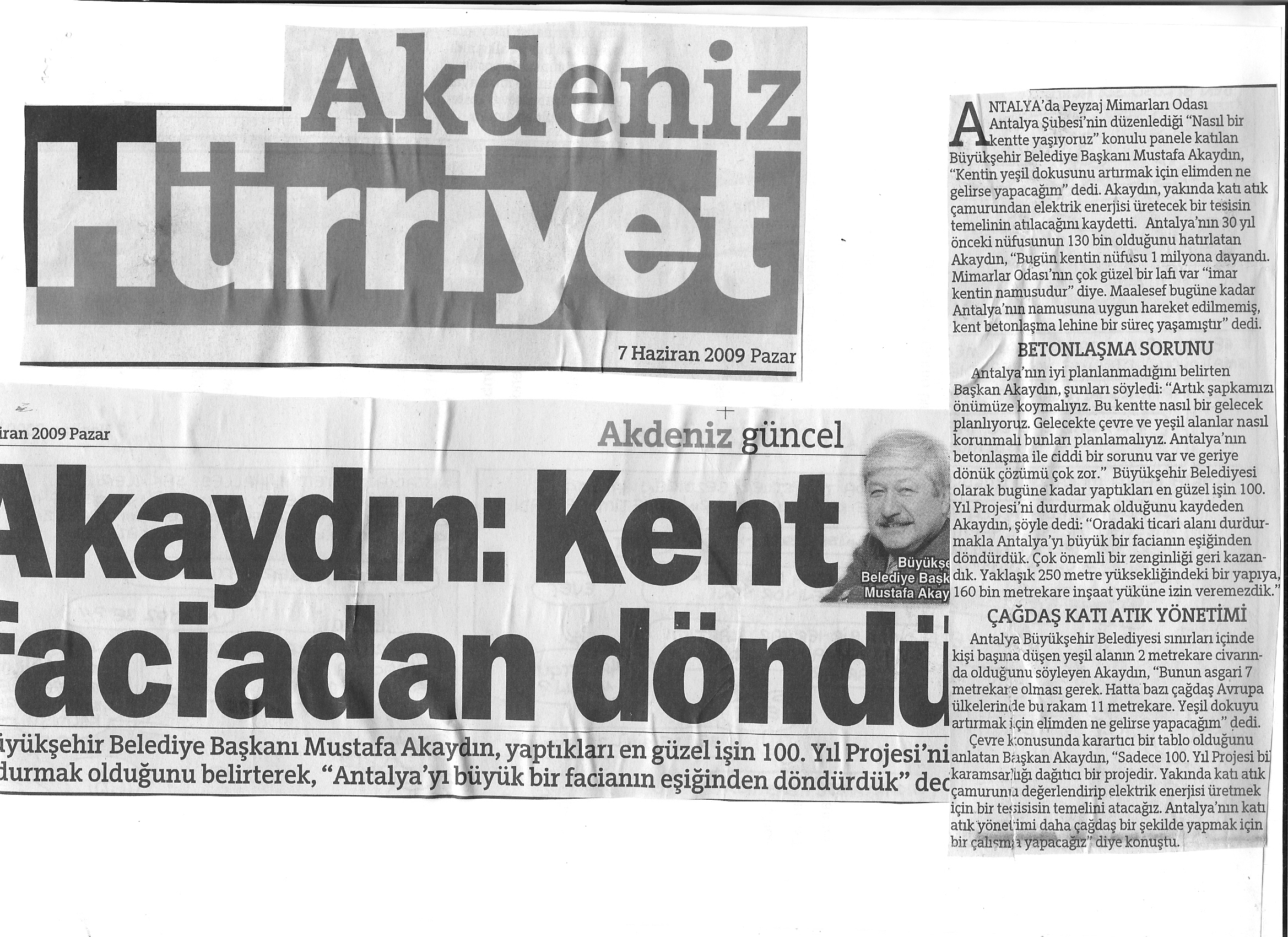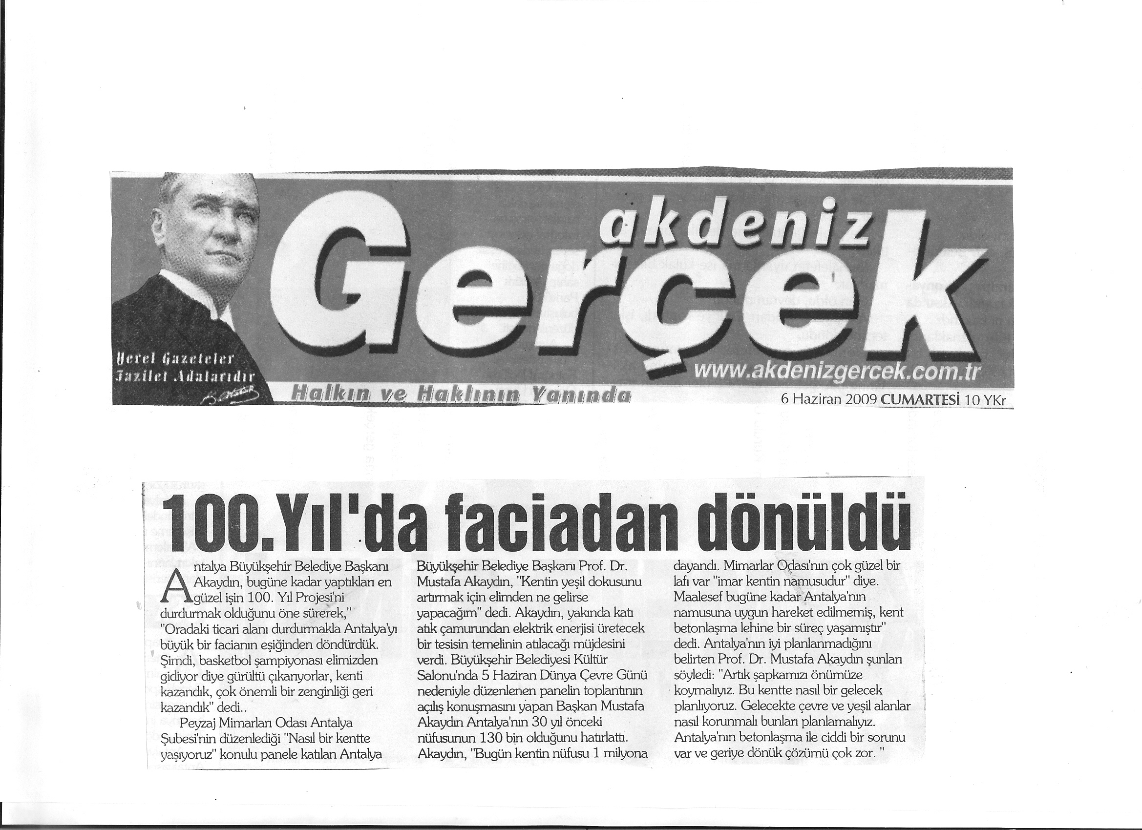 5 Haziran Dünya Çevre Günü dolayısı ile organize etmiş olduğumuz "Nasıl Bir Kentte Yaşıyoruz" konulu toplantı, 5 Haziran 2009 Cuma günü 13.00-16.00 saatleri arasında Antalya Büyükşehir Belediyesi Kültür Salonu‘ nda gerçekleştirilmiştir.