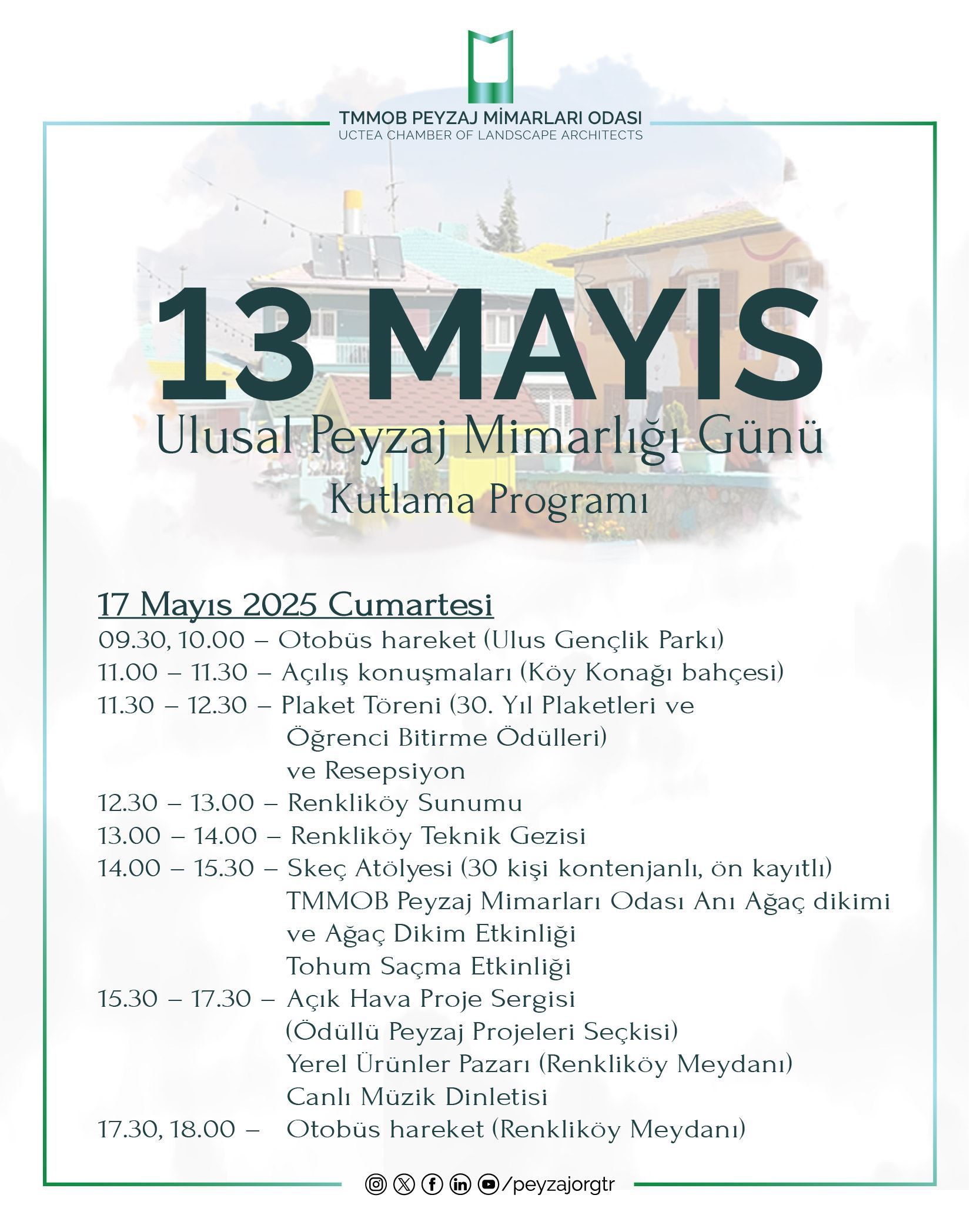 13 Mayıs Ulusal Peyzaj Mimarlığı Günü Kutlamaları için 17 Mayıs 2025 Cumartesi günü Ankara/Elmadağ – Renkliköy’de tüm meslektaşlarımızla bir arada olacağız! Meslekte 30. yılını tamamlayan üyelerimiz ve 12. Peyzaj Mimarlığı Öğrencileri Bitirme Projesi Ödüllerinin plaket töreninin yanı sıra gün boyu sürecek bir dizi etkinlikle Odamızın kuruluşunun 31. yılını kutlayacağımız 13 Mayıs Ulusal Peyzaj Mimarlığı Günü’nde siz değerli üyelerimizi de aramızda görmekten mutluluk duyarız.