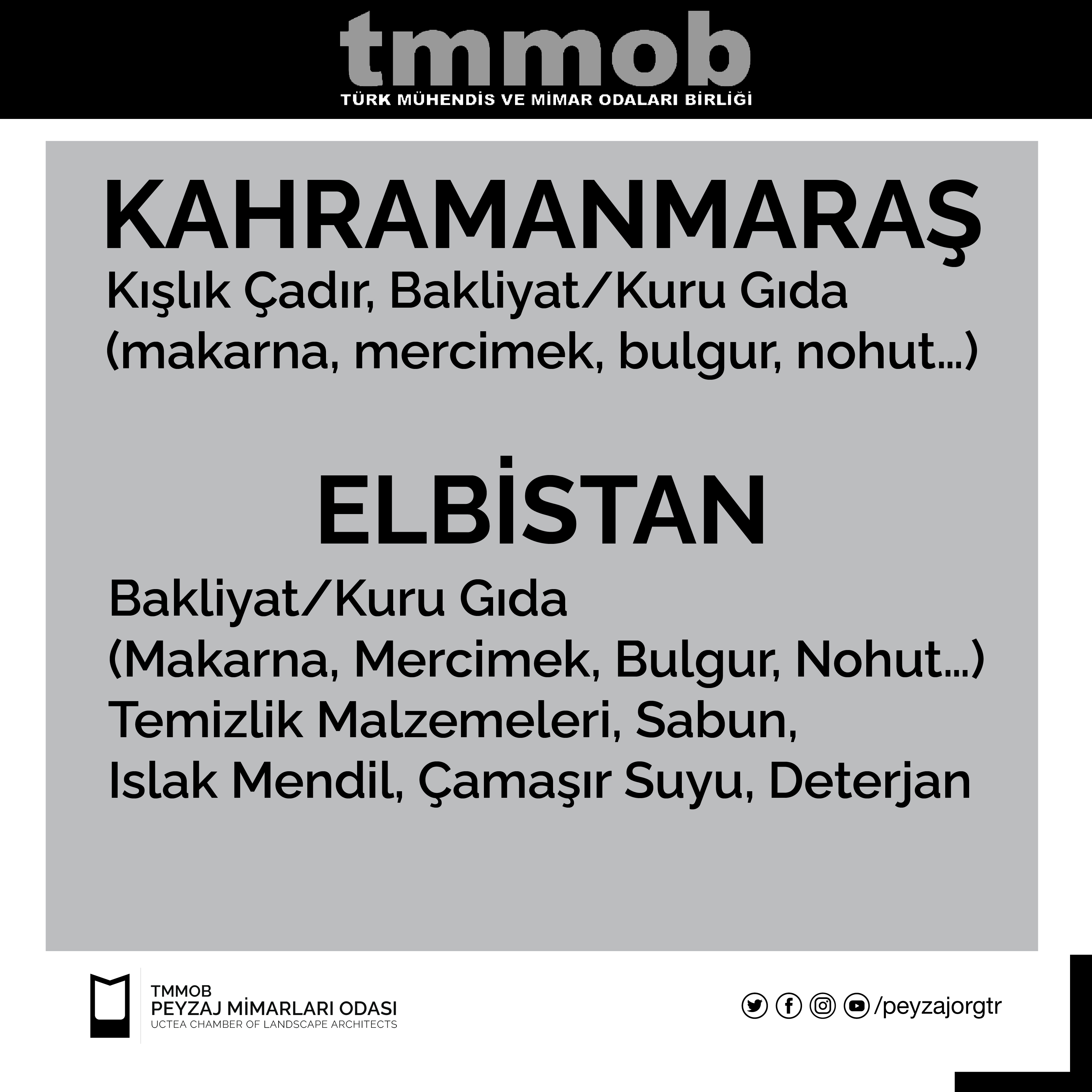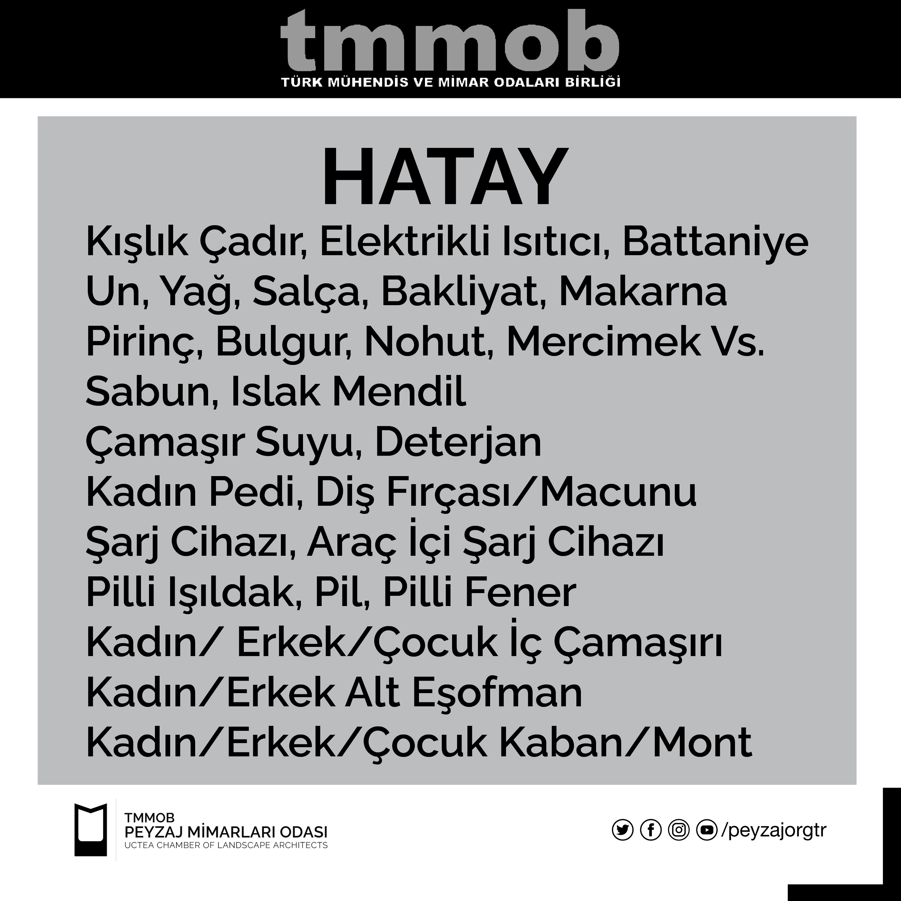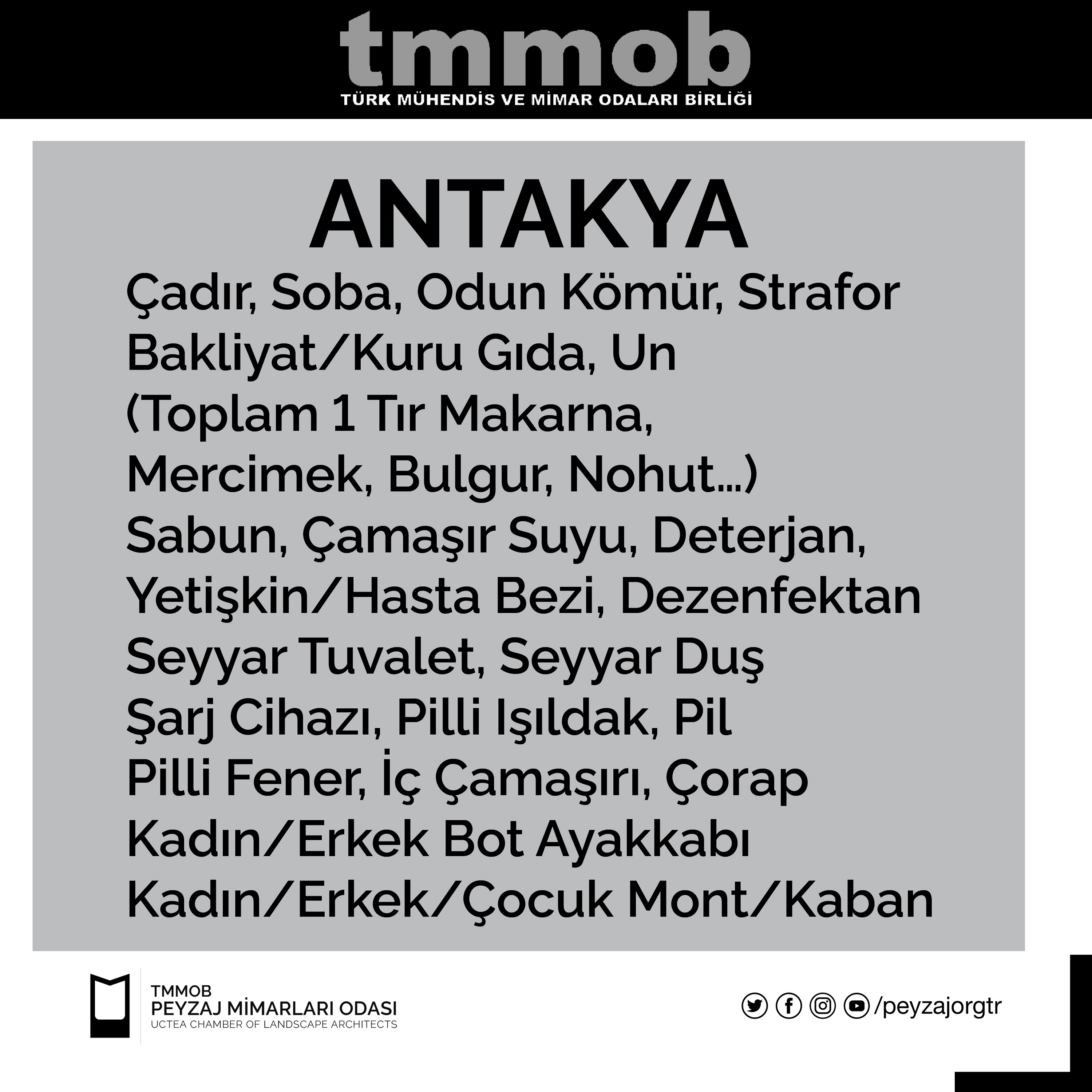 Bölgede bulunan TMMOB İKK yetkilileri tarafından 12 Şubat 2023 tarihi itibari ile iletilen güncel liste, gönderinin görsellerindeki gibidir. Listedeki yardımları ulaştırmak isteyen üyelerimiz, kendi bölgelerindeki İKK yardım noktalarına bu yardımlarını iletebilirler.