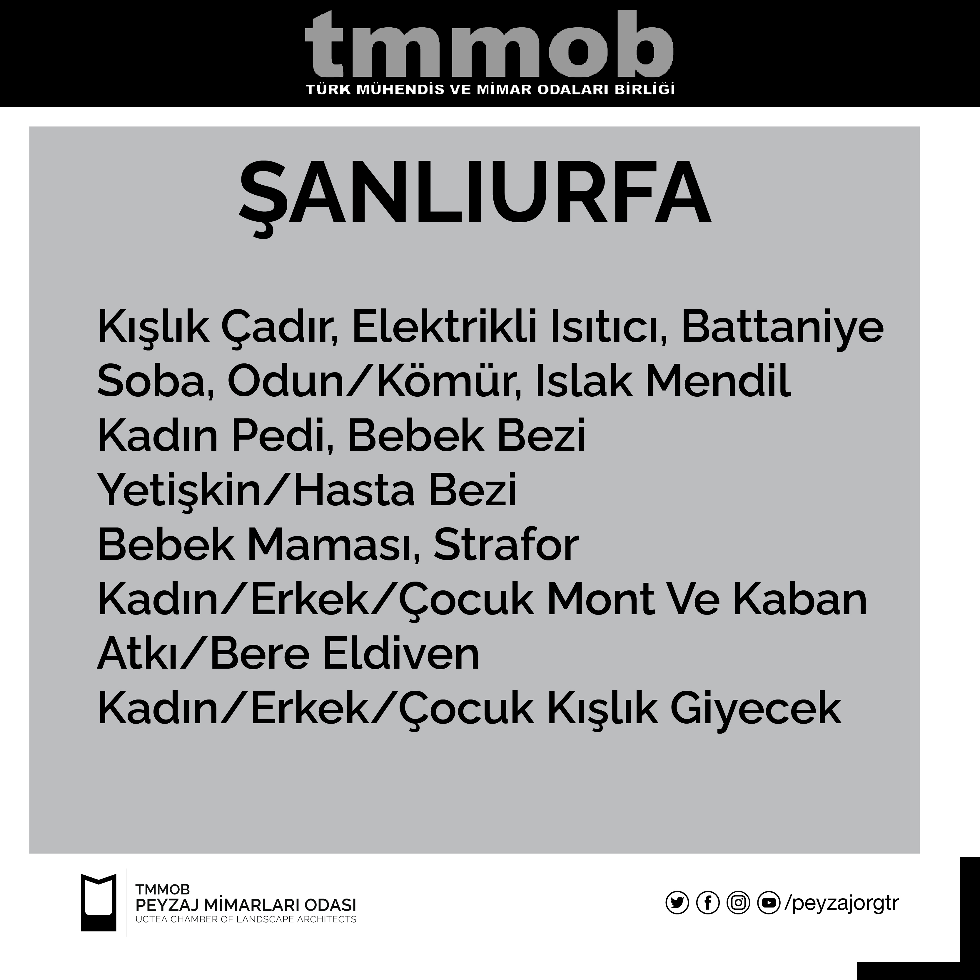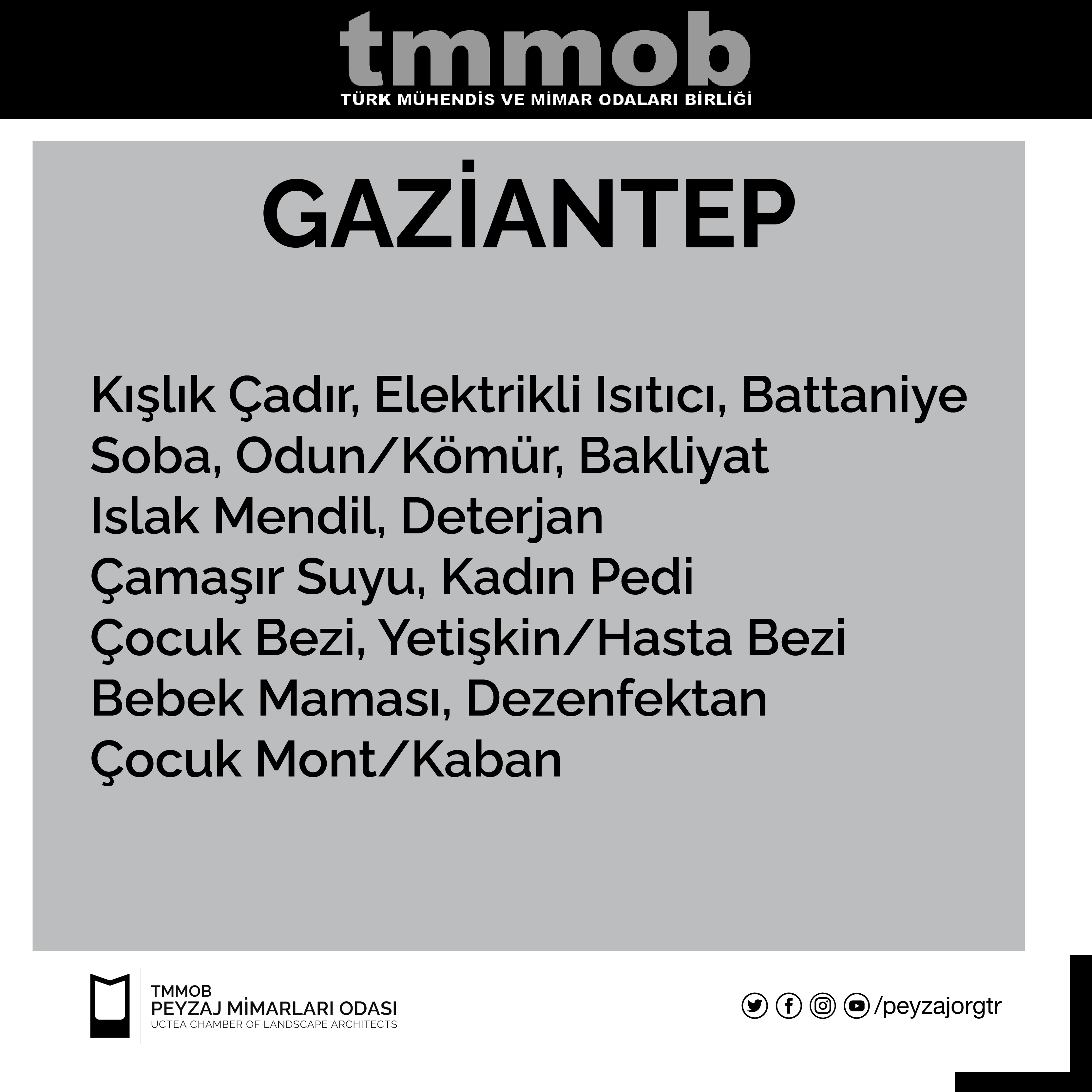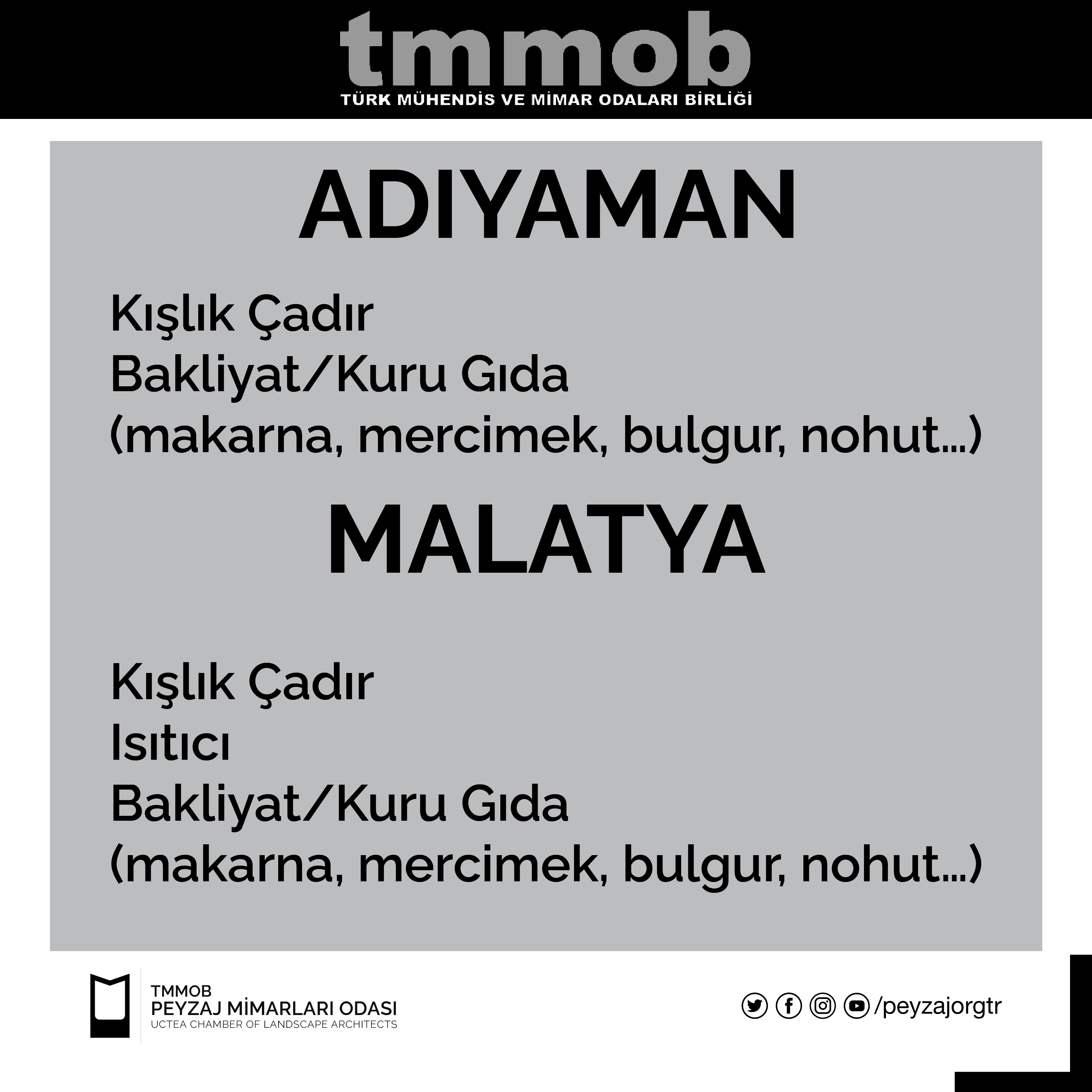 Bölgede bulunan TMMOB İKK yetkilileri tarafından 12 Şubat 2023 tarihi itibari ile iletilen güncel liste, gönderinin görsellerindeki gibidir. Listedeki yardımları ulaştırmak isteyen üyelerimiz, kendi bölgelerindeki İKK yardım noktalarına bu yardımlarını iletebilirler.