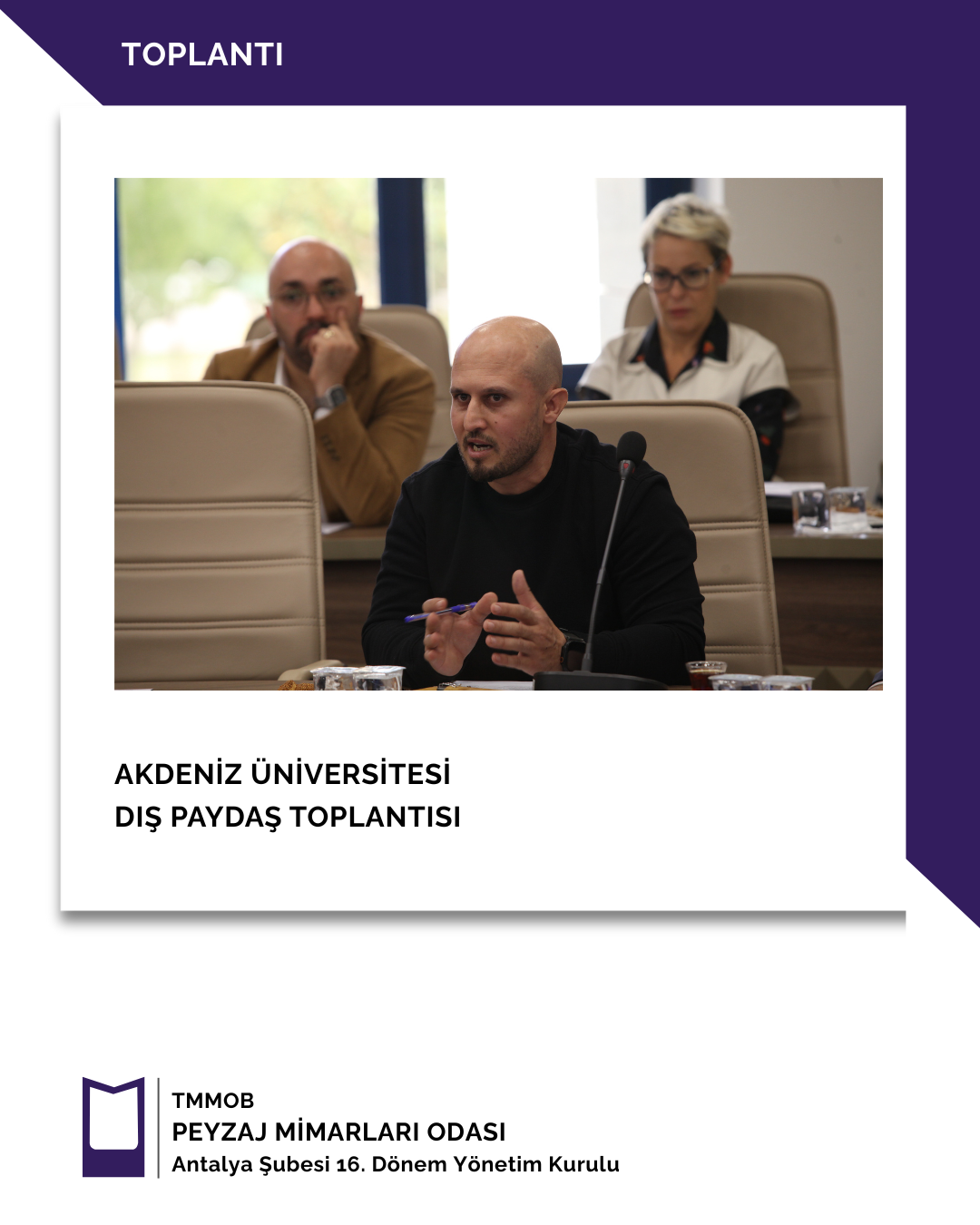 19 Kasım 2025 tarihinde Akdeniz Üniversitesi tarafından Antalya'daki kamu kurumları, meslek örgütleri ve sivil toplum kuruluşlarının geniş katılımıyla gerçekleştirilen Dış Paydaş toplantısına Şubemizi temsilen Şube Yönetim Kurulu Üyesi Süleyman AYDOĞMUŞ katılım sağlamıştır.