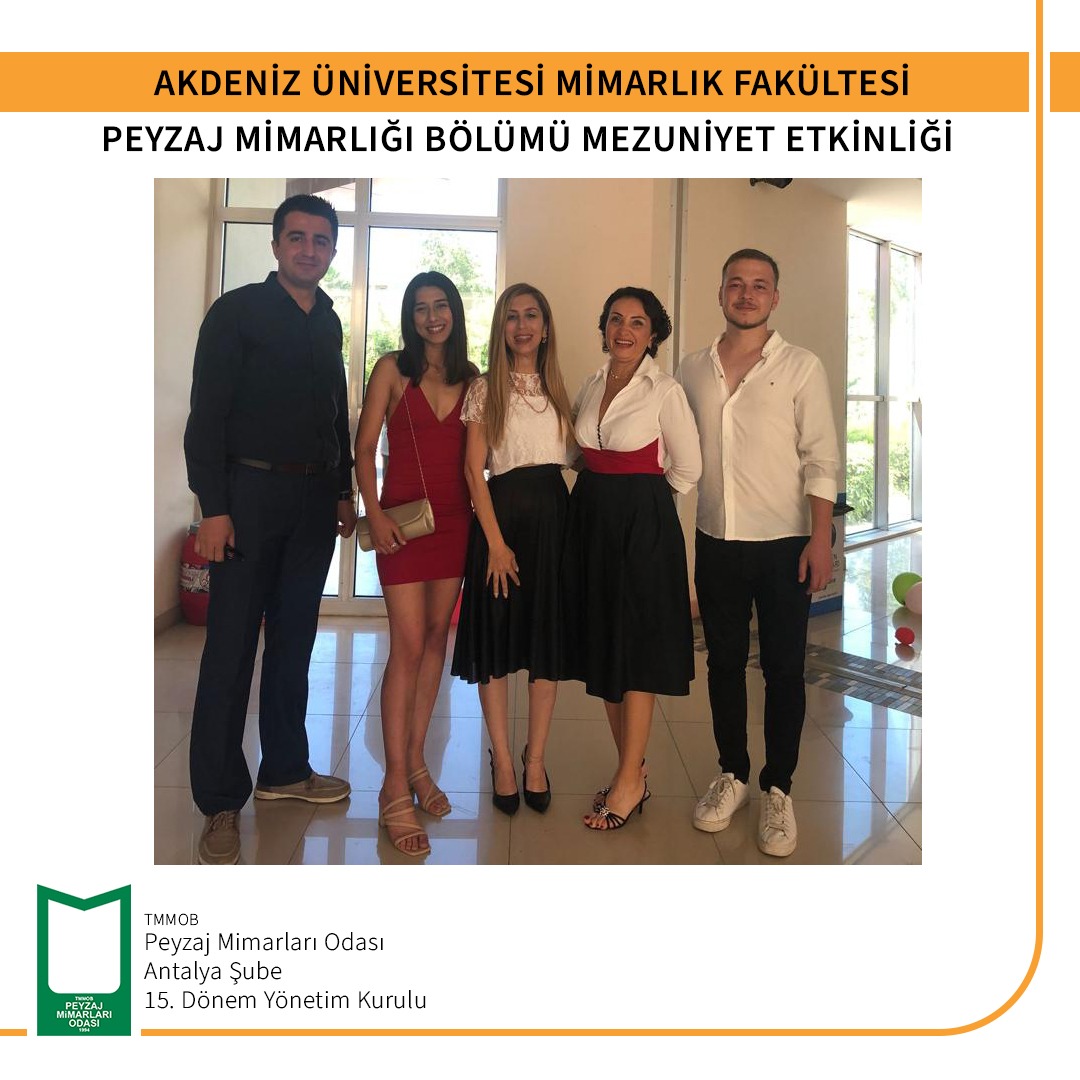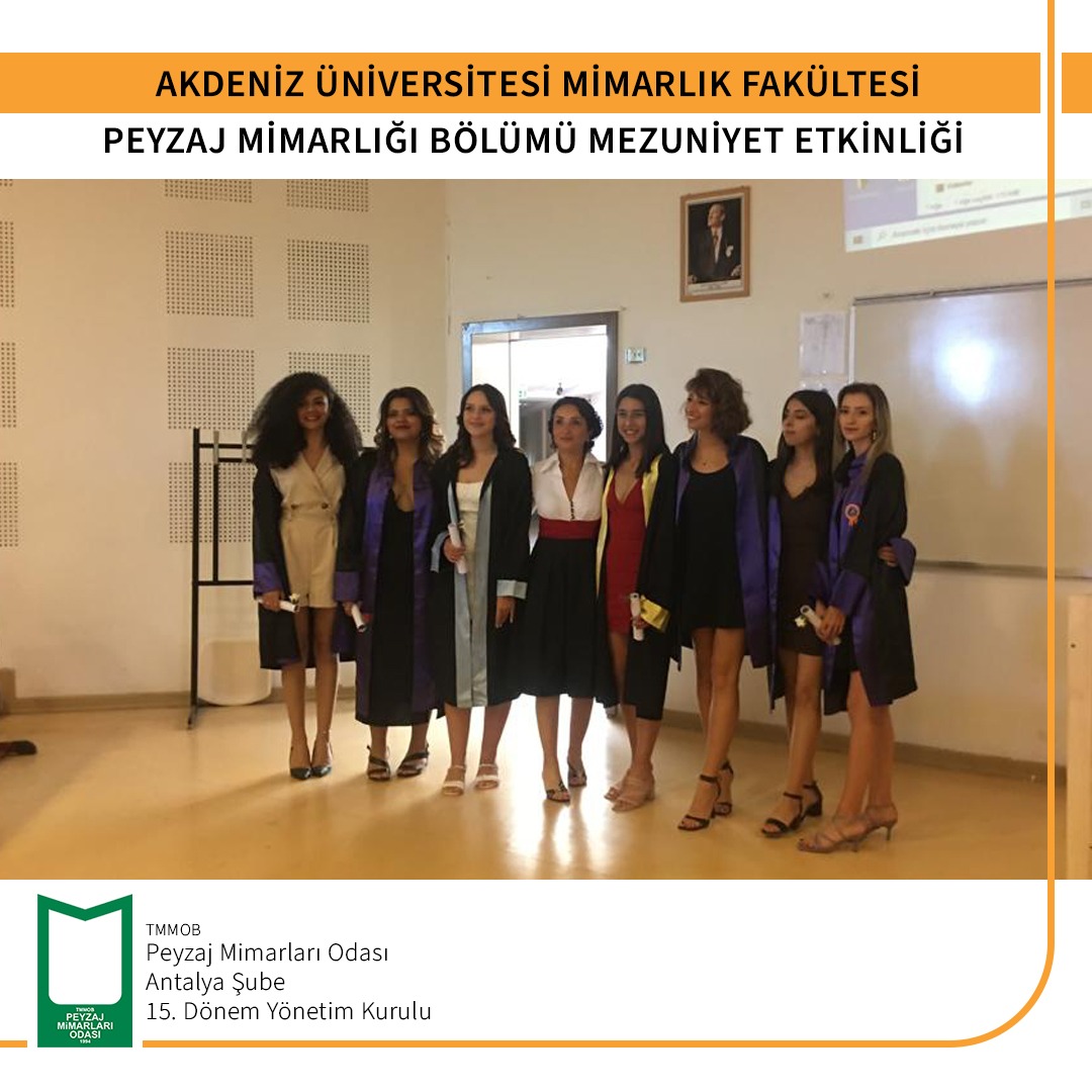 17 Haziran 2022 tarihinde gerçekleştirilen Akdeniz Üniversitesi Mimarlık Fakültesi Peyzaj Mimarlığı Bölümü Mezuniyet Töreni`ne TMMOB Peyzaj Mimarları Odası Antalya Şubesi Şube Başkanı Gülsüm KILDAN katılım sağlamıştır.