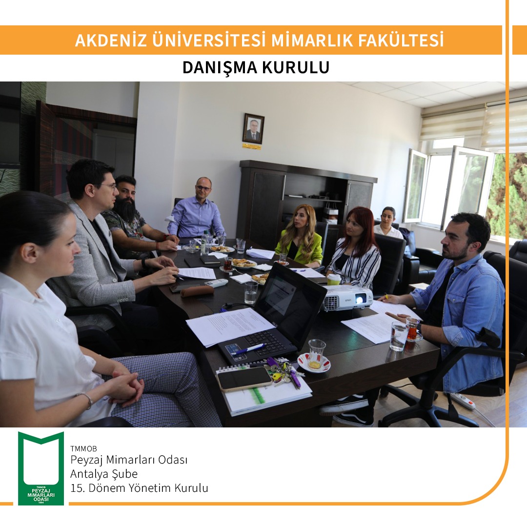 Akdeniz Üniversitesi Mimarlık Fakültesi Dekanlığı tarafından kurulan Danışma Kurulu`nun toplantısına TMMOB Peyzaj Mimarları Odası Antalya Şubesi adına Yönetim Kurulu Başkanı Gülsüm KILDAN katılım sağlamıştır.