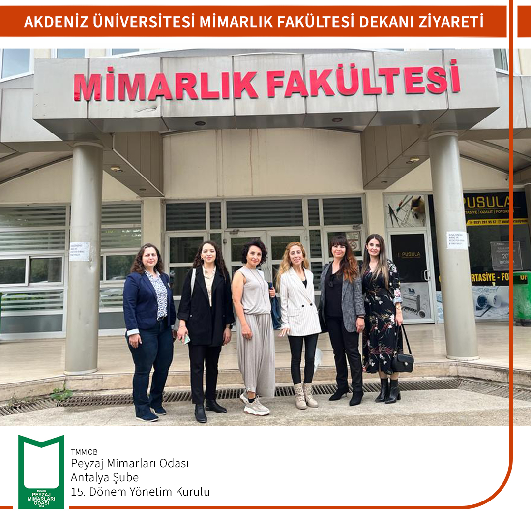 22.05.2023 tarihinde,Şube Başkanı Gülsüm KILDAN, Şube 2. Başkanı Reyhan ERDOĞAN, Şube Yazmanı Omca COŞARCAN KAYA, Yönetim Kurulu Üyesi Sena ATAKUL, Yönetim Kurulu Yedek Üyesi Rabia Canay IŞIKLI ve Antalya İKK Kadın Komisyonu Temsilcisi Bensu CÜCE, Akdeniz Üniversitesi Mimarlık Fakültesi Dekanı Prof. Dr. Zuhal KAYNAKCI ELİNÇ`i ziyaret etmişlerdir.