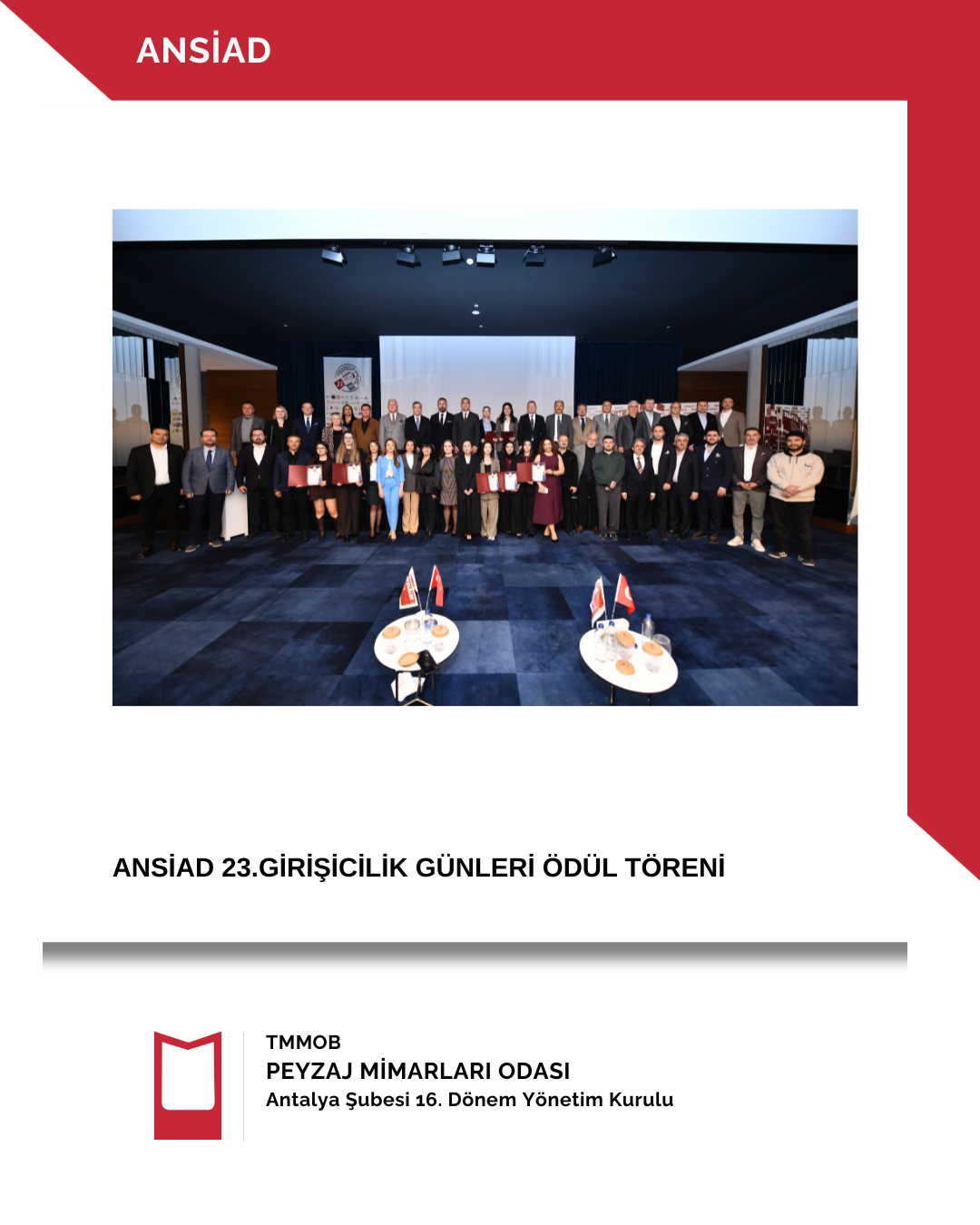 Bu yıl 23.sü düzenlenen ve birçok Üniversite, Belediye, TMMOB Odaları ve STK’nın paydaş olduğu Ansiad Girişimcilik Projesinde Peyzaj Mimarları Odası Antalya Şubesi olarak yer almanın gururu ve mutluluğu içindeyiz. Bu proje kapsamında üniversite öğrencilerden oluşan ekiplerin projeleri değerlendirildi ve teşvik edildi. Lise ve üniversite öğrencilerine gelecekleri ile ilgili mentörlükler yapıldı.