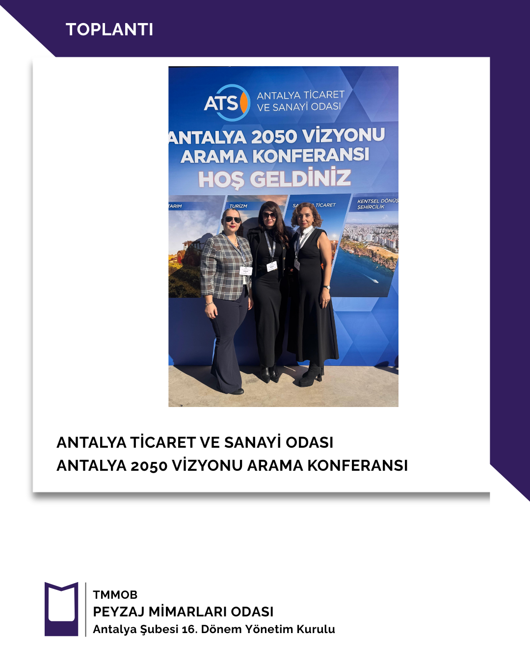 12-13-14 Aralik 2025 tarihlerinde Antalya Ticaret ve Sanayi Odası (ATSO) tarafından, sürdürülebilir kalkınma hedefleri doğrultusunda kentin sosyo-ekonomik yapısını güçlendirmek ve yaşam kalitesini artırmak amacıyla düzenlenen “Antalya 2050 Vizyonu Arama Konferansı” davetine şubemizi temsilen Şube II.Başkanı Canay IŞIKLI ve Şube Saymanı Bensu CÜCE katılım sağlamıştır.