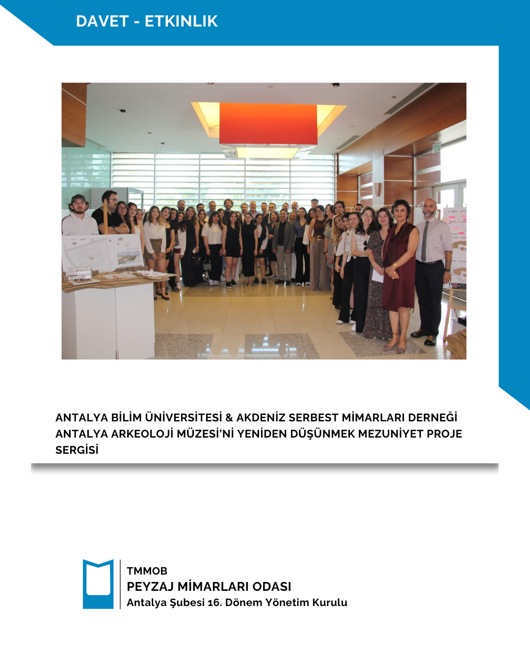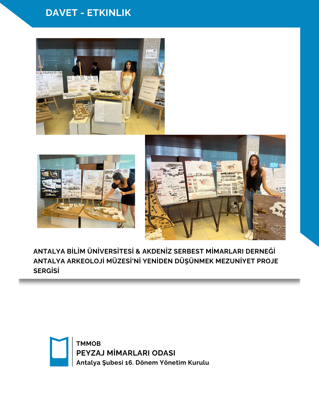 30 Mayıs 2025 tarihinde Antalya Bilim Üniversitesi Güzel Sanatlar ve Mimarlık Fakültesi mimarlık bölümü ve Akdeniz Serbest Mimarları Derneği işbirliği ile gerçekleştirilen Antalya arkeoloji müzesini yeniden düşünmek konulu bitirme projesi sergisine şubemizi temsilen Şube Başkanı Gülsüm KILDAN katılım sağlamıştır.