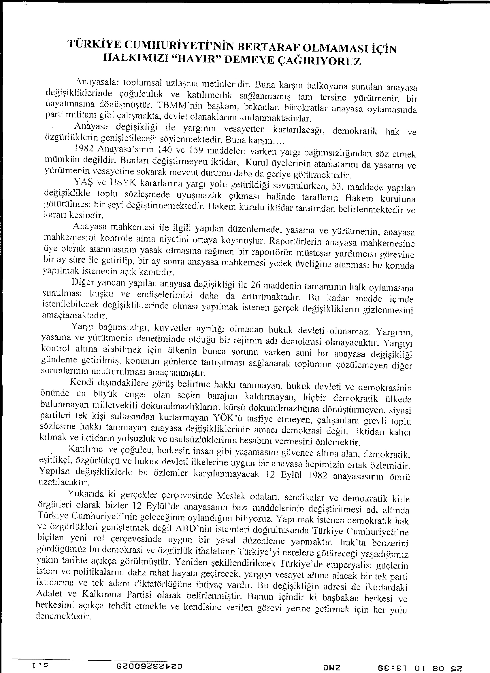 "TÜRKİYE CUMHURİYETİ‘ NİN BERTARAF OLMAMASI İÇİN HALKIMIZI HAYIR DEMEYE ÇAĞIRIYORUZ!"