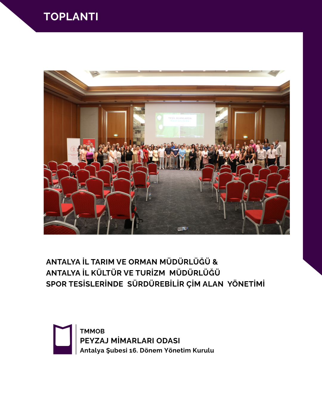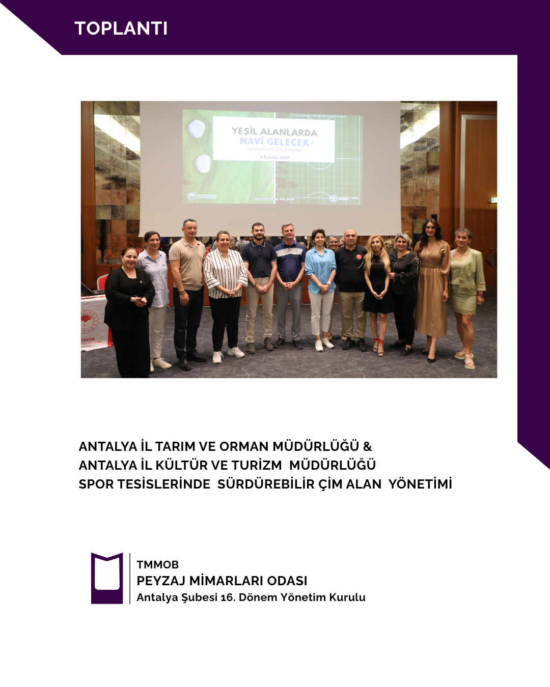 03 Temmuz 2025 tarihinde Antalya İl Tarım ve Orman Müdürlüğü ve Antalya İl Kültür ve Turizm Müdürlüğü iş birliğinde düzenlenen Spor Tesisleri'nde Sürdürebilir Çim Alan Yönetimi Toplantısı gerçekleştirilmiştir. Toplantıya Şubemizi Temsilen Şube Başkanımız Gülsüm KILDAN katılım sağlamıştır.