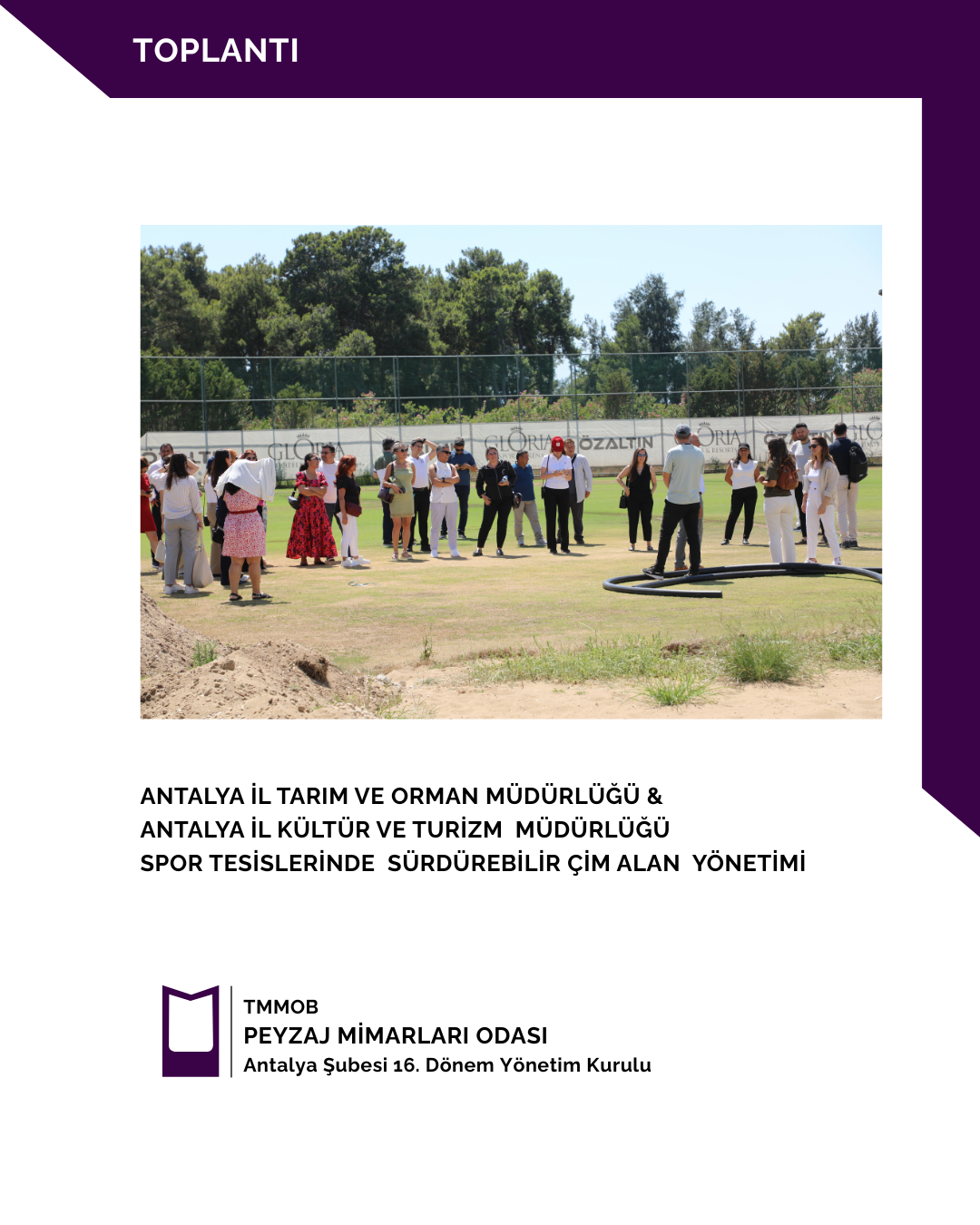 Toplantıda;Antalya da turizm tesislerinde Kurakçıl Peyzaj yaygınlaştırılması, su verimliliği ve çevresel sürdürebilirliğin turizm tesislerindeki çim alan yönetiminde stratejik öneme sahip olduğu vurgulandı. Toplantı sonrası golf ve futbol sahalarında teknik gezi düzenlendi.