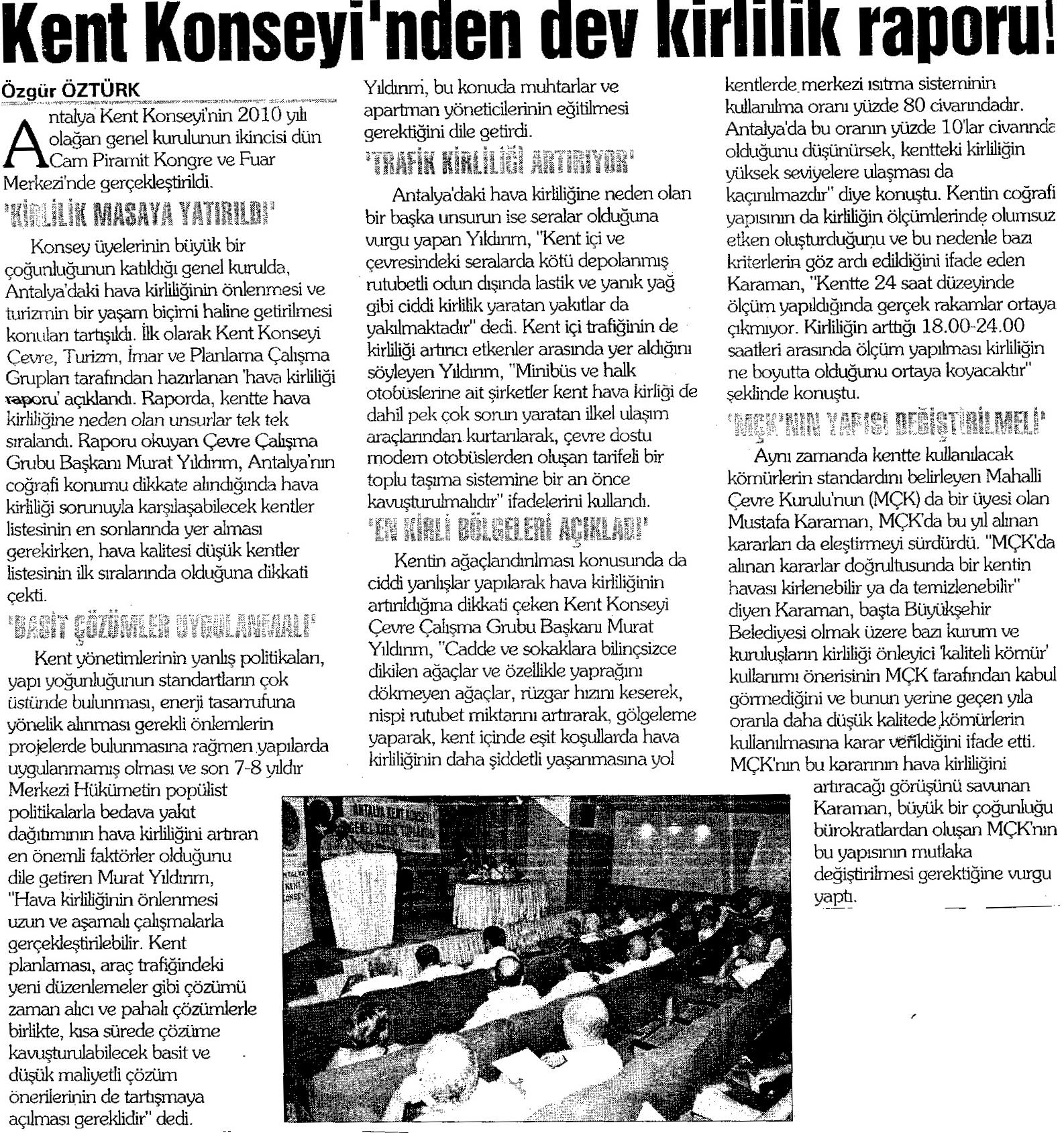 Antalya Çevre Gönüllüleri Derneği Başkanı Murat YILDIRIM, ABB Meclis Üyesi Antalya Mahalli Çevre Kurulu Üyesi Mustafa KARAMAN, Prof. Dr. Tuncay NEYİŞÇİ ve Kent Konseyi Tarım Grubu Başkanı Adnan ÖZÇELİK‘ in söz aldığı kurulda, konsey Hava Kirliliği Raporu katılımcılarla paylaşılmıştır.