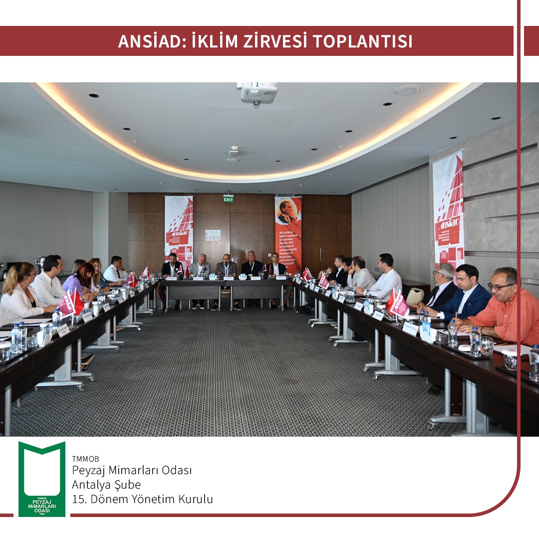 31 Mayıs 2022 tarihinde ANSİAD tarafından gerçekleştirilen İklim Zirvesi Toplantısına TMMOB Peyzaj Mimarları Odası Antalya Şubesi`ni temsilen Yönetim Kurulu Başkanı Gülsüm KILDAN katılım sağlamıştır.
