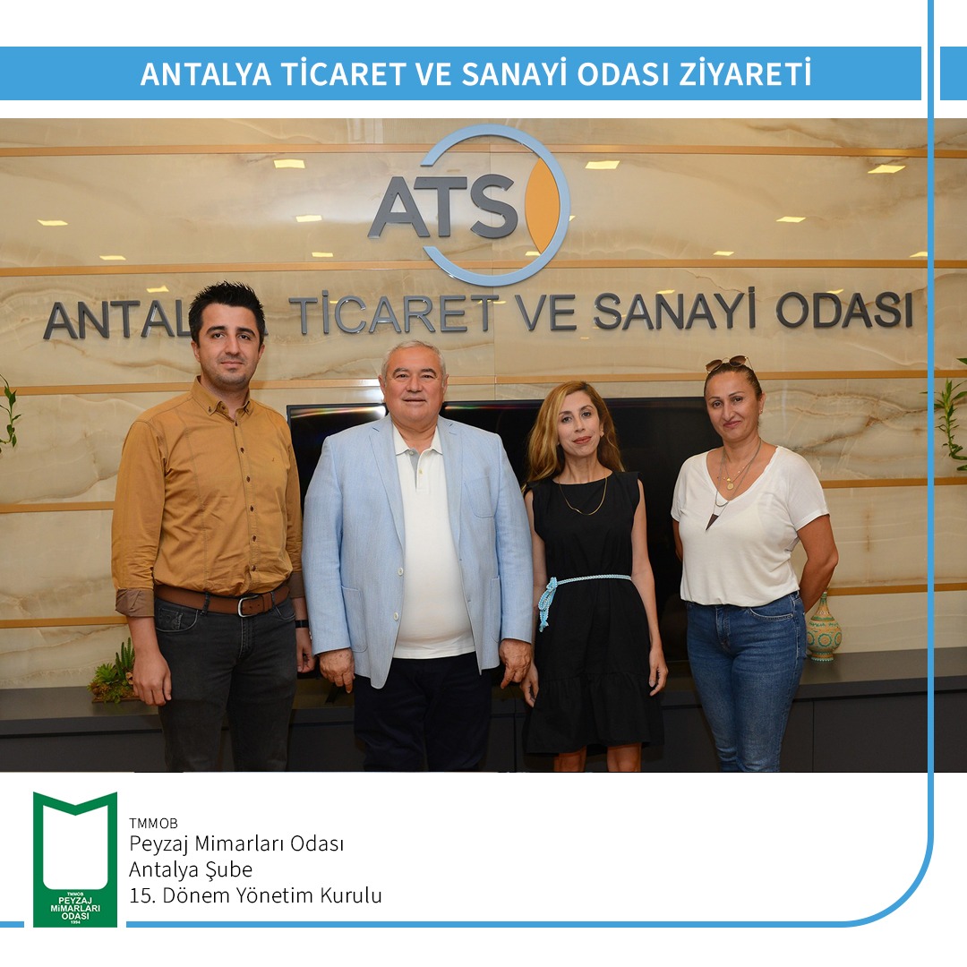 20 Temmuz 2022 tarihinde TMMOB Peyzaj Mimarları Odası Antalya Şubesi 15. Dönem Yönetim Kurulu olarak Şube Başkanı Gülsüm KILDAN, Şube Yazmanı Rıfat OLGUN ve Yönetim Kurulu Yedek Üyesi Ayla ERYILMAZ Antalya Ticaret ve Sanayi Odasına ziyaret gerçekleştirmiştir.