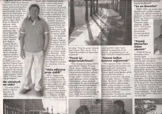 Antalya Expres Gazetesi‘nin Şube Başkanımız Teoman AKÇALI ile 2016 yılında Antalya‘da gerçekleştirilecek olan Dünya Botanik Expo‘su -EXPO 2016- organizasyonuna dair gerçekleştirmiş olduğu röportajın birinci sayfada tam sayfa yayınlanan haberine aşağıdaki link ve ekli dosyalar aracılığı ile ulaşabilirsiniz.