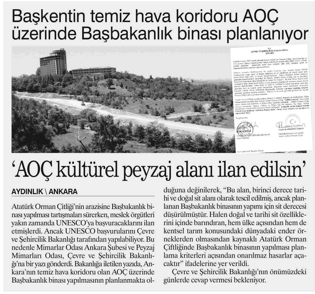 ‘AOÇ kültürel peyzaj alanı ilan edilsin‘ AYDINLIK ANKARA Atatürk Orman Çitliği‘nin arazisine Başbakanlık binası yapılması tartışmaları sürerken, meslek örgütleri yakın zamanda UNESCO‘ya başvuracaklarını ilan etmişlerdi. Ancak UNESCO başvurularını Çevre ve Şehircilik Bakanlığı tarafından yapılabiliyor. Bu nedenle Mimarlar Odası Ankara Şubesi ve Peyzaj Mimarları Odası, Çevre ve Şehircilik Bakanlığı‘na bir yazı gönderdi. Bakanlığa iletilen yazıda, Ankara‘nın temiz hava koridoru olan AOÇ üzerinde Başbakanlık binası yapılmasının planlanmakta olduğuna değinilerek, "Bu alan, birinci derece tarihi ve doğal sit alanı olarak tescil edilmiş, ancak planlanan Başbakanlık binasının yapımı için sit derecesi düşürülmüştür. Halen doğal ve tarihi sit özelliklerini içinde barındıran, hem ülke açısından hem de kentsel tarım konusundaki dünyadaki ender örneklerden olmasından kaynaklı Atatürk Orman Çiftliğinde Başbakanlık binasının yapılması planlama kriterleri açısından onarılmaz hasarlar açacaktır" ifadelerine yer verildi. Çevre ve Şehircilik Bakanlığının önümüzdeki günlerde cevap vermesi bekleniyor. Başkentin temiz hava koridoru AOÇ üzerinde Başbakanlık binası planlanıyor.