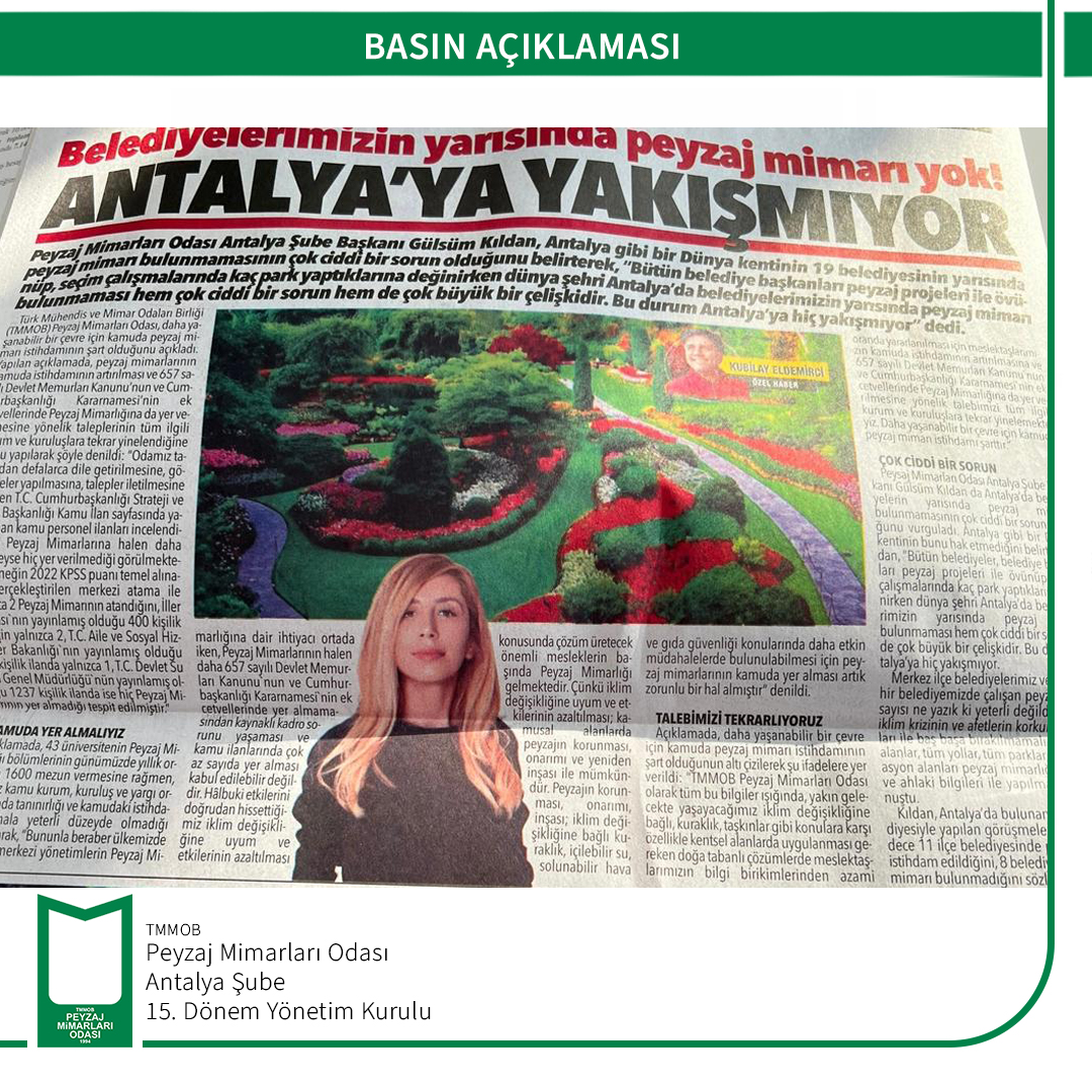TMMOB Peyzaj Mimarları Odası Antalya Şubesi Şube Başkanı Gülsüm KILDAN, Antalya`daki belediyelerin yarısında peyzaj mimarı olmadığına ilişkin basın açıklamasında bulunmuştur.