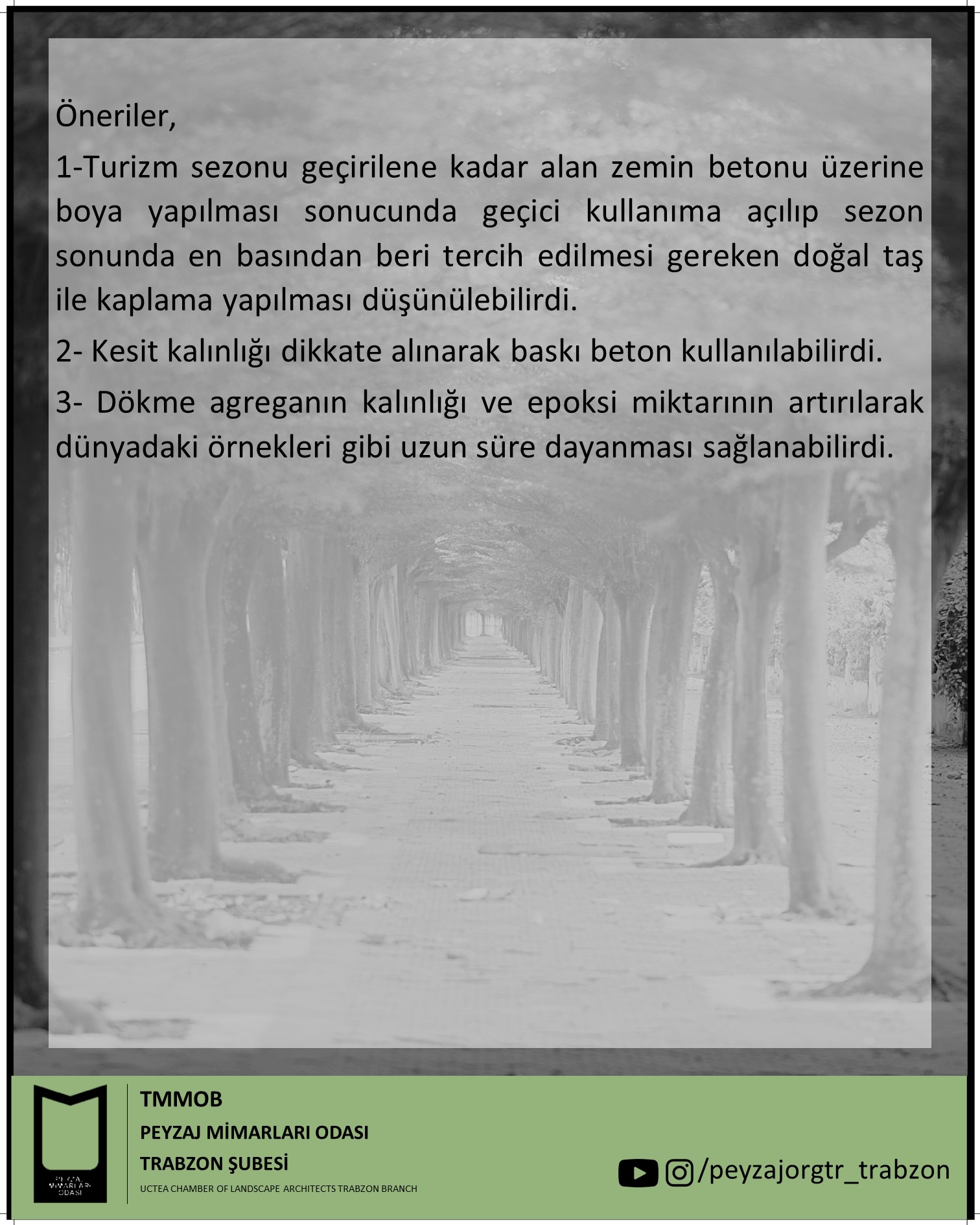 1-Turizm sezonu geçirilene kadar alan zemin betonu üzerine boya yapılması sonucunda geçici kullanıma açılıp sezon sonunda en basından beri tercih edilmesi gereken doğal taş ile kaplama yapılması düşünülebilirdi.