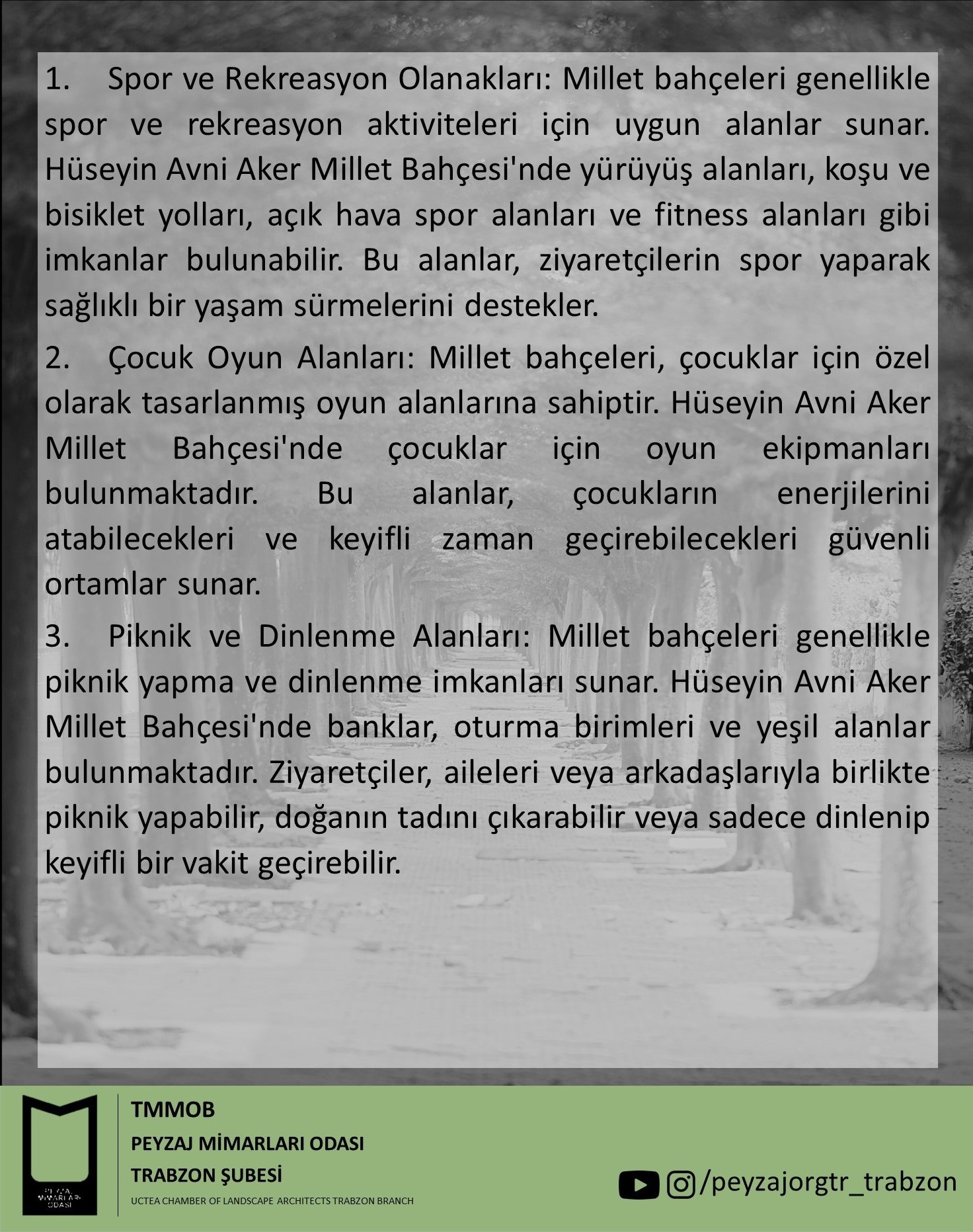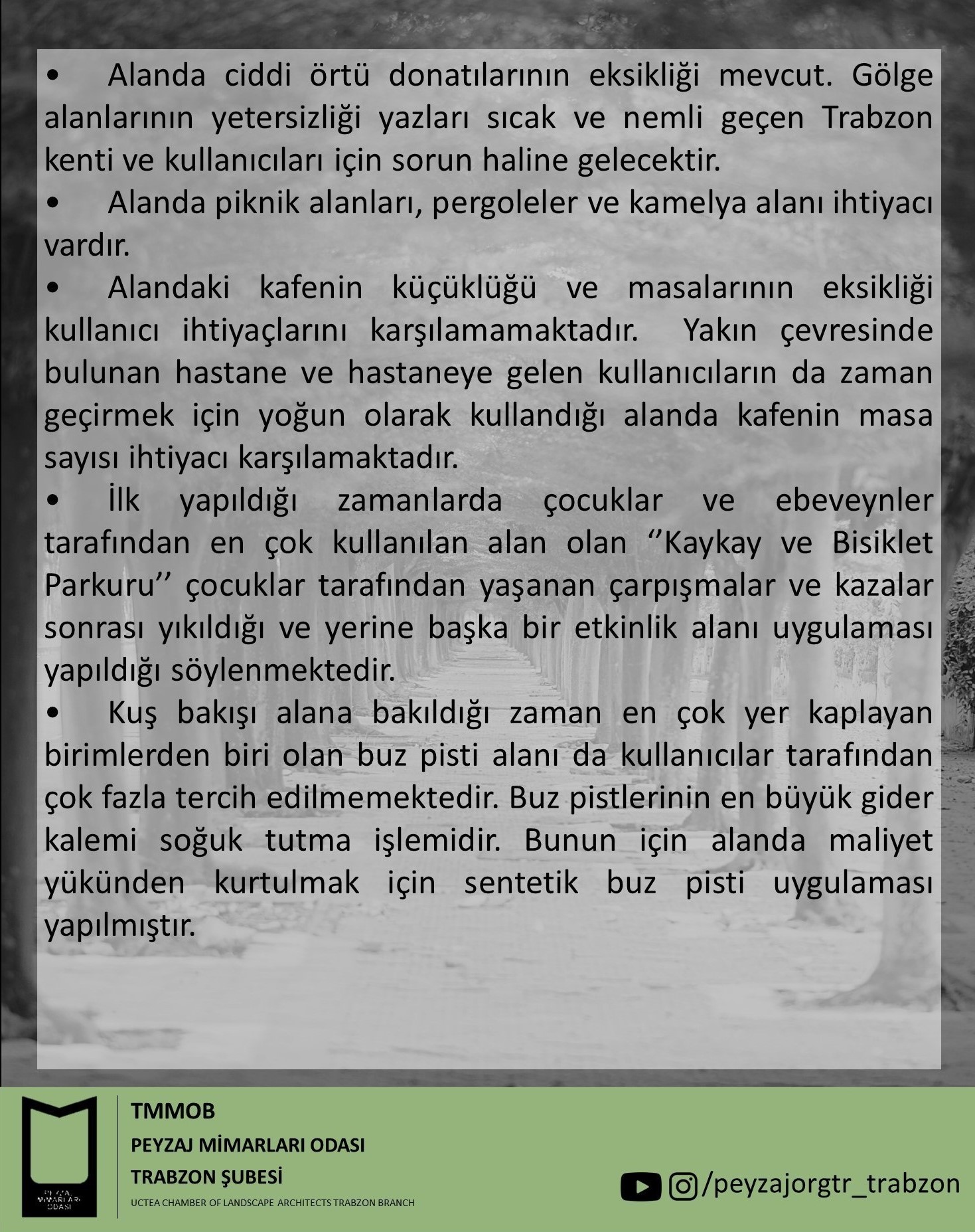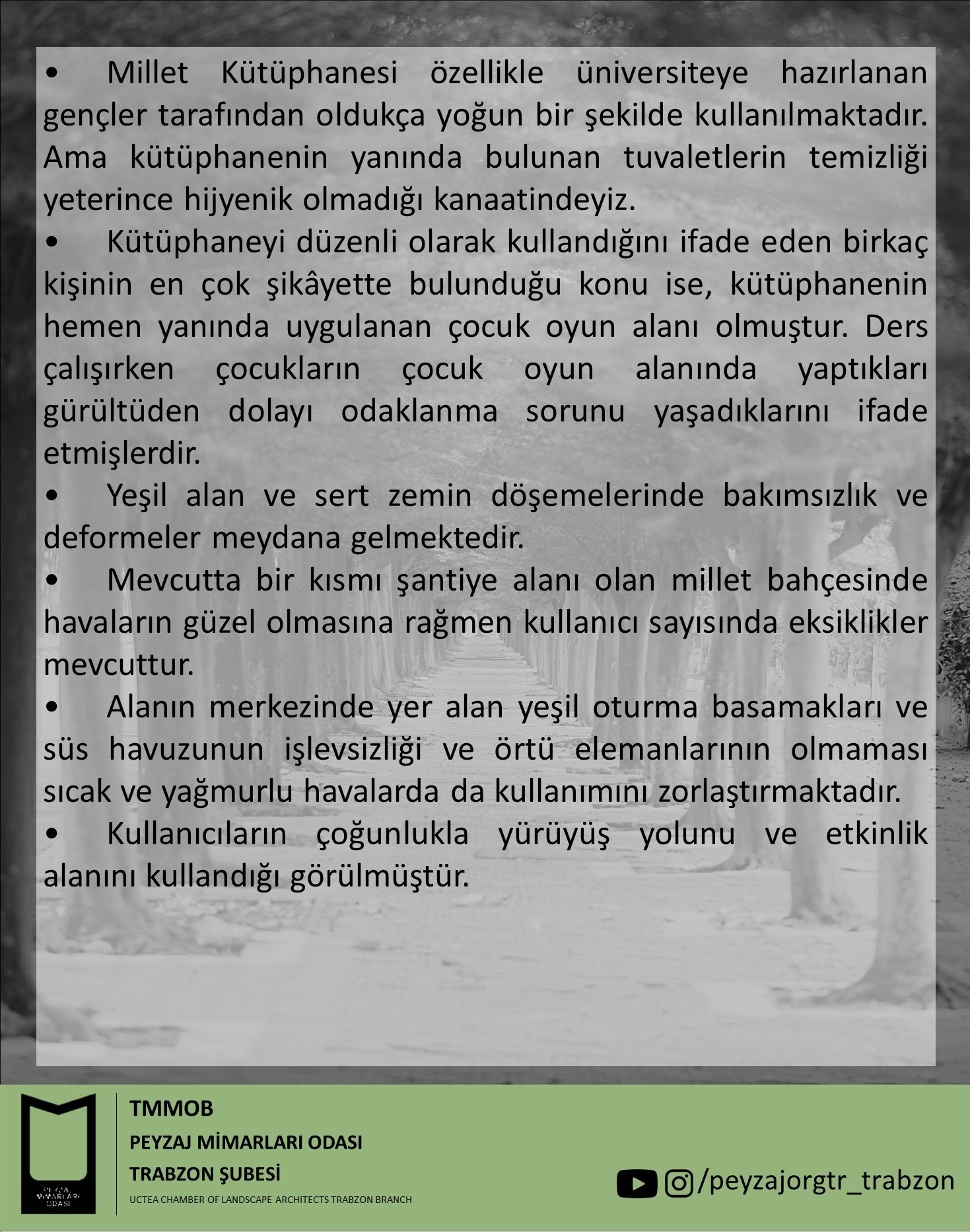 Peki `TMMOB Peyzaj Mimarları Odası Trabzon Şube`` olarak alanda nabız tuttuğumuz zaman kullanıcılar tarafından tarafımıza iletilen Hüseyin Avni Aker Millet Bahçesinin eksikleri ve eleştiri konuları neler?