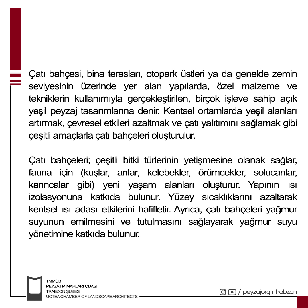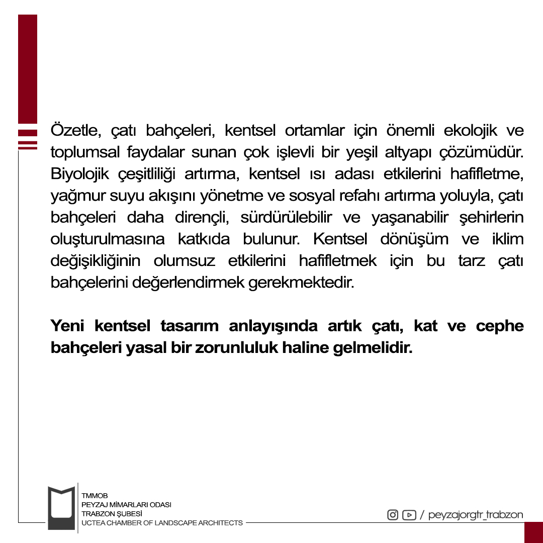 Özetle, çatı bahçeleri, kentsel ortamlar için önemli ekolojik ve toplumsal faydalar sunan çok işlevli bir yeşil altyapı çözümüdür. Biyolojik çeşitliliği artırma, kentsel ısı adası etkilerini hafifletme, yağmur suyu akışını yönetme ve sosyal refahı artırma yoluyla, çatı bahçeleri daha dirençli, sürdürülebilir ve yaşanabilir şehirlerin oluşturulmasına katkıda bulunur. Kentsel dönüşüm ve iklim değişikliğinin olumsuz etkilerini hafifletmek için bu tarz çatı bahçelerini değerlendirmek gerekmektedir. Yeni kentsel tasarım anlayışında artık çatı, kat ve cephe bahçeleri yasal bir zorunluluk haline gelmelidir.