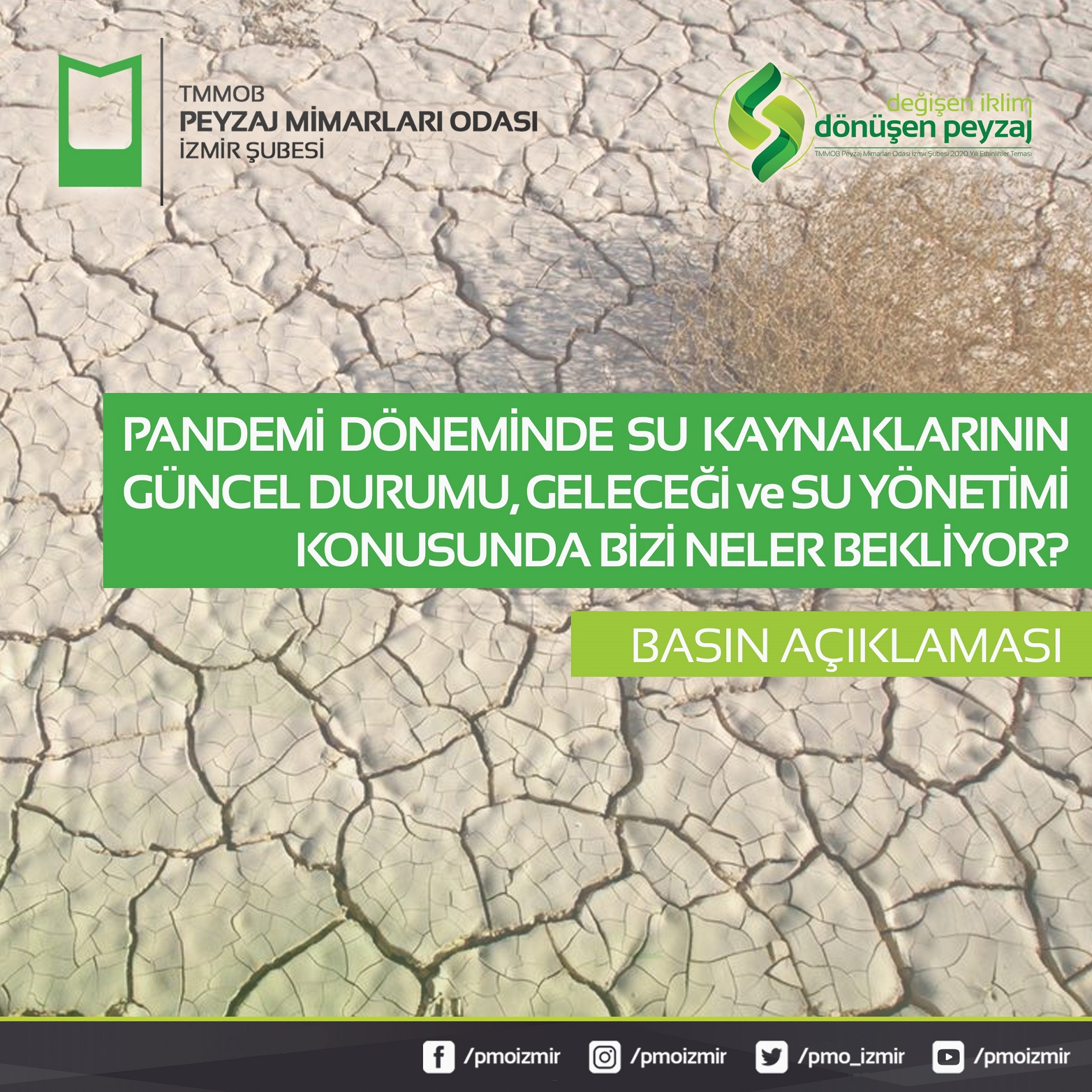 Tüm dünyada etkisini sarsıcı bir şekilde gösteren Yeni Nesil Coronavirüs (covid-19) pandemisinin su kaynakları ve bu kaynakların yönetimi üzerine olan etkilerine dikkat çekmek amacıyla TMMOB Peyzaj Mimarları Odası İzmir Şubesi tarafından 5 Mayıs 2020 tarihinde yazılı basın açıklaması gerçekleştirildi.
