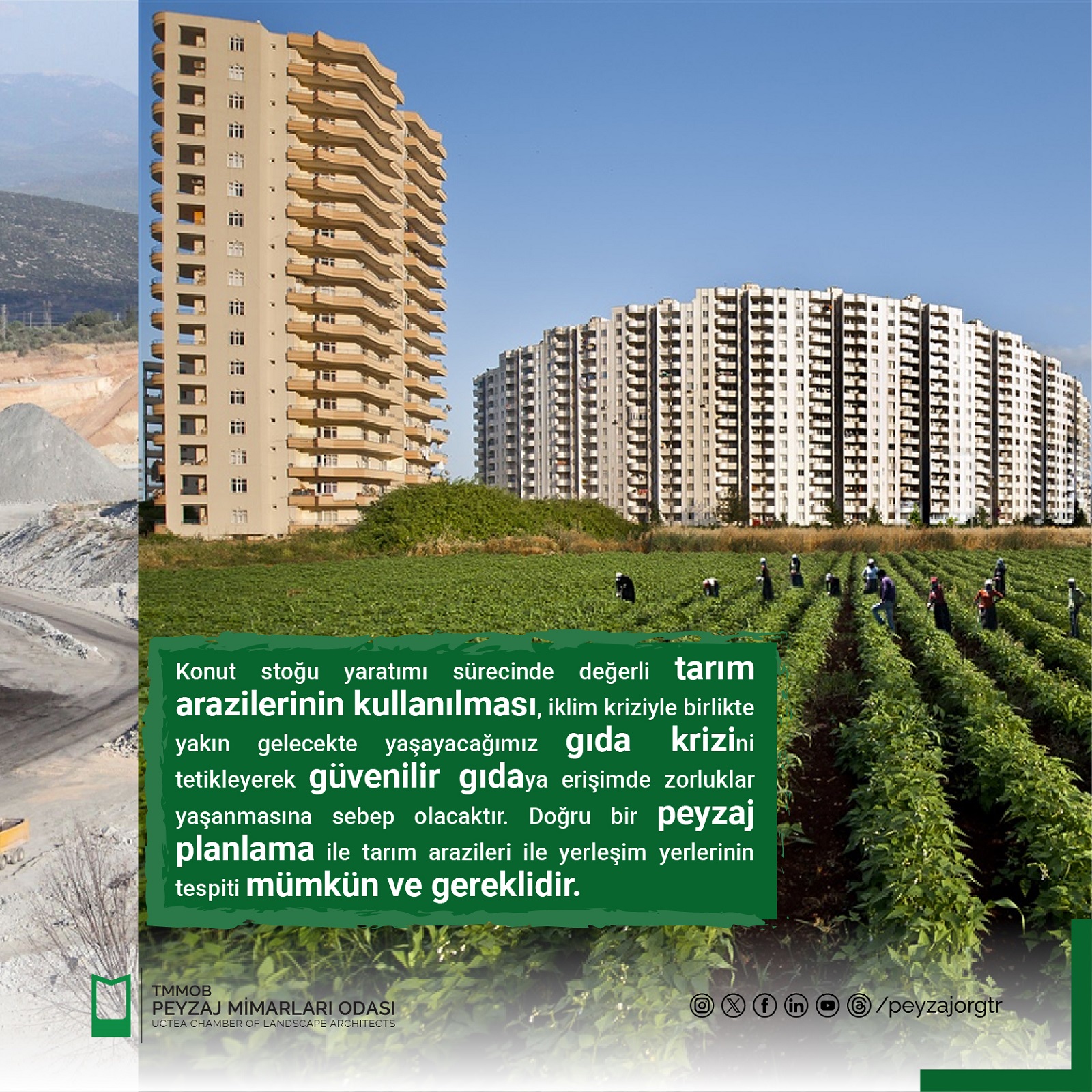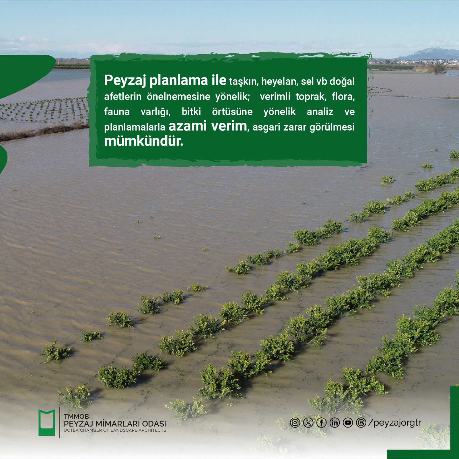Ülkemiz kentsel ve kırsal alan planlama, tasarım ve uygulamalarında, doğal ve kültürel peyzajı toplumsal ve kalkınma politikaları doğrultusunda planlayabilen bir meslek disiplini olan peyzaj mimarlığı mesleği, maalesef kamuda yeterli sayıda istihdam edilmemektedir. Biyoçeşitlilik, yağmur suyu yönetimi, doğa tabanlı çözümler, mavi/yeşil altyapı, kırsal peyzaj planlama, yenebilir peyzaj, doğal peyzaj ve daha birçok tarım ve orman ile ilgili faaliyetler, doğrudan peyzaj mimarlarının iş tanımı içerisindedir.