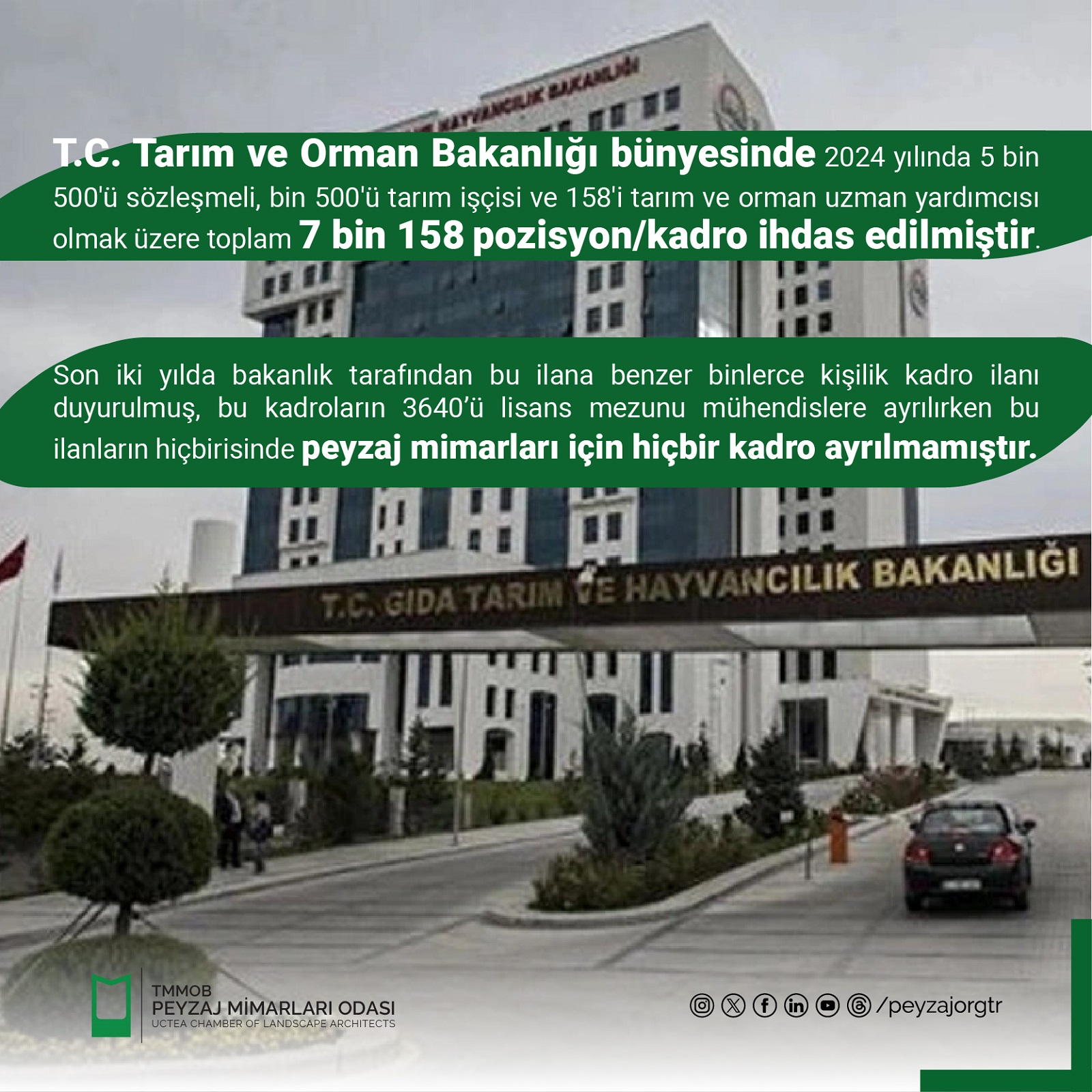T.C. Tarım ve Orman Bakanlığı bünyesinde 2024 yılında 5 bin 500ü sözleşmeli, bin 500ü tarım işçisi ve 158i tarım ve orman uzman yardımcısı olmak üzere toplam 7 bin 158 pozisyon/kadro bizzat Sayın Bakan İbrahim Yumaklı tarafından açıklanmıştır. Son iki yılda bakanlık tarafından bu ilana benzer binlerce kişilik kadro ilanı duyurulmuş, bu kadroların 3640`ü lisans mezunu mühendislere ayrılırken bu ilanların hiçbirisinde peyzaj mimarları için hiçbir kadro ayrılmamıştır.