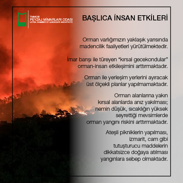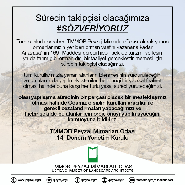 Tüm bunlarla beraber; TMMOB Peyzaj Mimarları Odası olarak yanan ormanlarımızın yeniden orman vasfını kazanana kadar Anayasa`nın 169. Maddesi gereği "169. Madde. Devlet, ormanların korunması ve sahalarının genişletilmesi için gerekli kanunları koyar ve tedbirleri alır. Yanan ormanların yerinde yeni orman yetiştirilir, bu yerlerde başka çeşit tarım ve hayvancılık yapılamaz." hiçbir şekilde turizm, yerleşim ya da tarım gibi orman dışı bir faaliyet gerçekleştirilmemesi için sürecin takipçisi olacağımızı, tüm kurullarımızla yanan alanların izlenmesinin sürdürüleceğini ve bu alanlarda yapılmak istenilen her hangi bir yapısal faaliyet olması halinde buna karşı her türlü yasal süreci yürüteceğimizi, bu yapılaşma sürecinin bir parçası olacak meslektaşımız olması halinde Odamız disiplin kurulları aracılığı ile gerekli cezalandırmaları yapacağımızı ve hiçbir şekilde bu alanlar için proje onayı yapmayacağımızı kamuoyuna bildiririz.