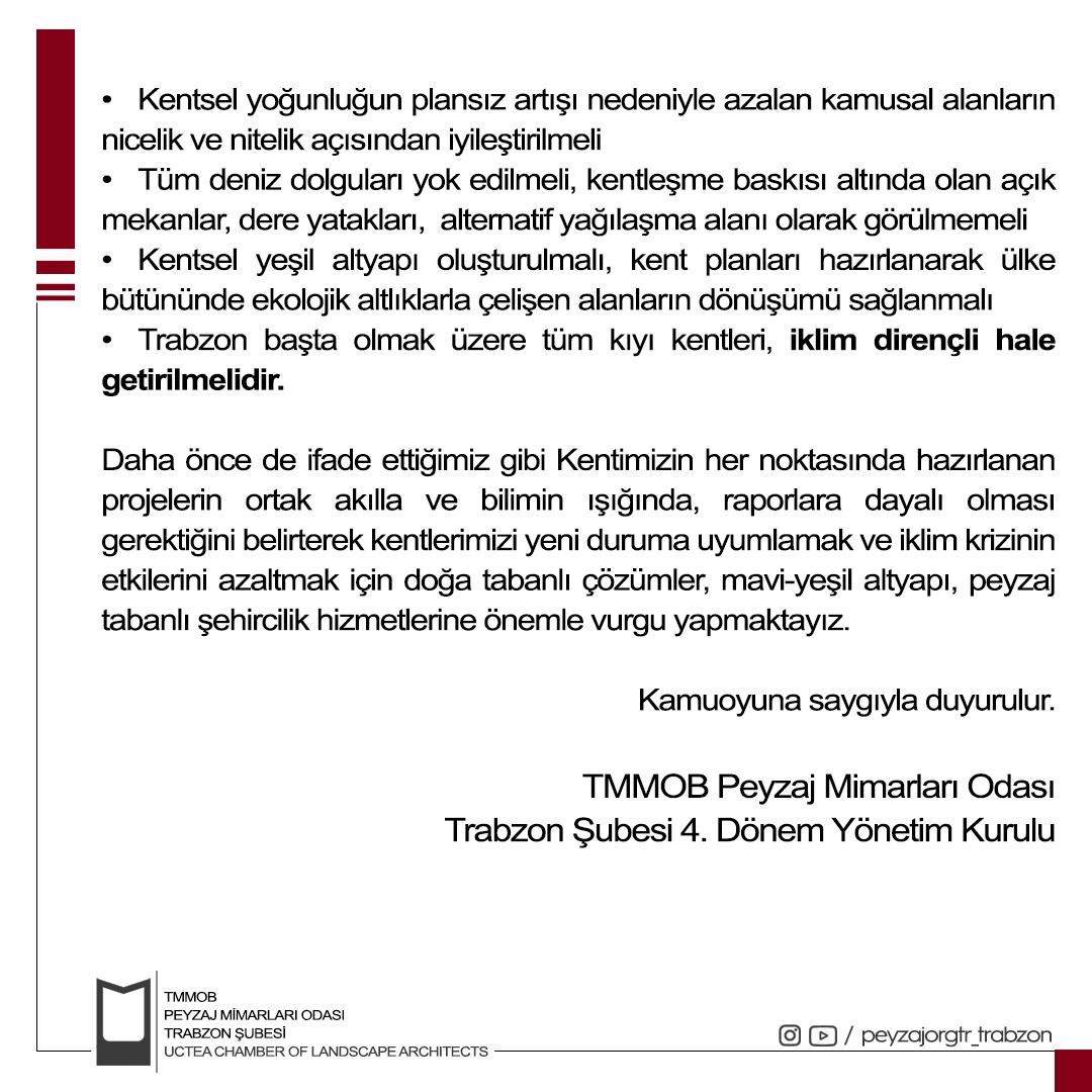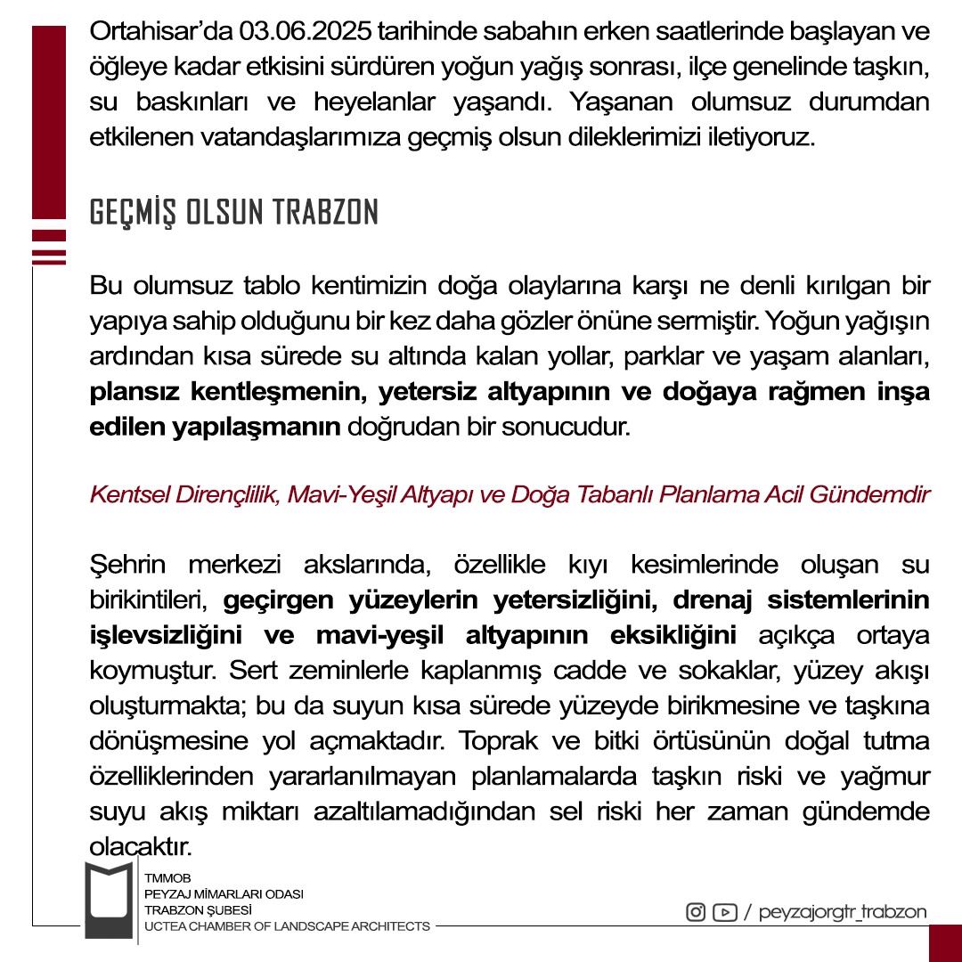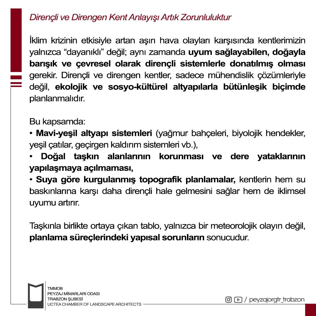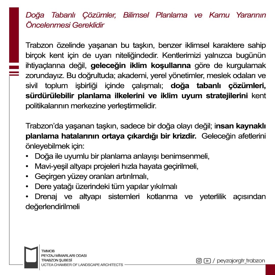 Trabzon özelinde yaşanan bu taşkın, benzer iklimsel karaktere sahip birçok kent için de uyarı niteliğindedir. Kentlerimizi yalnızca bugünün ihtiyaçlarına değil, geleceğin iklim koşullarına göre de kurgulamak zorundayız. Bu doğrultuda; akademi, yerel yönetimler, meslek odaları ve sivil toplum işbirliği içinde çalışmalı; doğa tabanlı çözümleri, sürdürülebilir planlama ilkelerini ve iklim uyum stratejilerini kent politikalarının merkezine yerleştirmelidir.